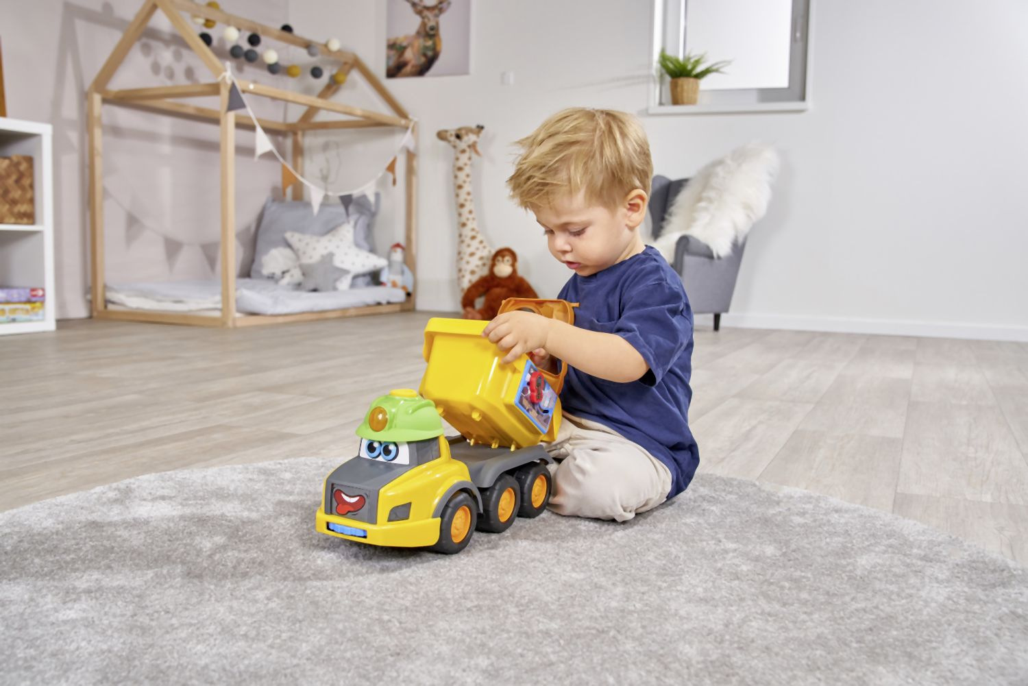 Nákladní auto Harry Hauler s očíčky pro nejmenší. Na volnoběh, třídění tvarů - 3 tvary chrastítek k vložení, zvukový a světelný efekt, posuvné prvky, různá čela, sklápeč dolů a nahoru. Délka 30 cm.
