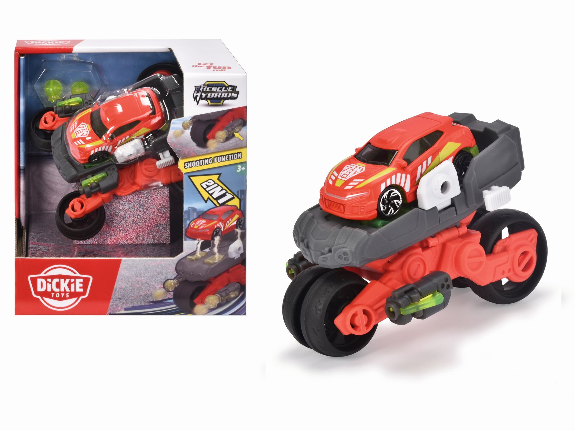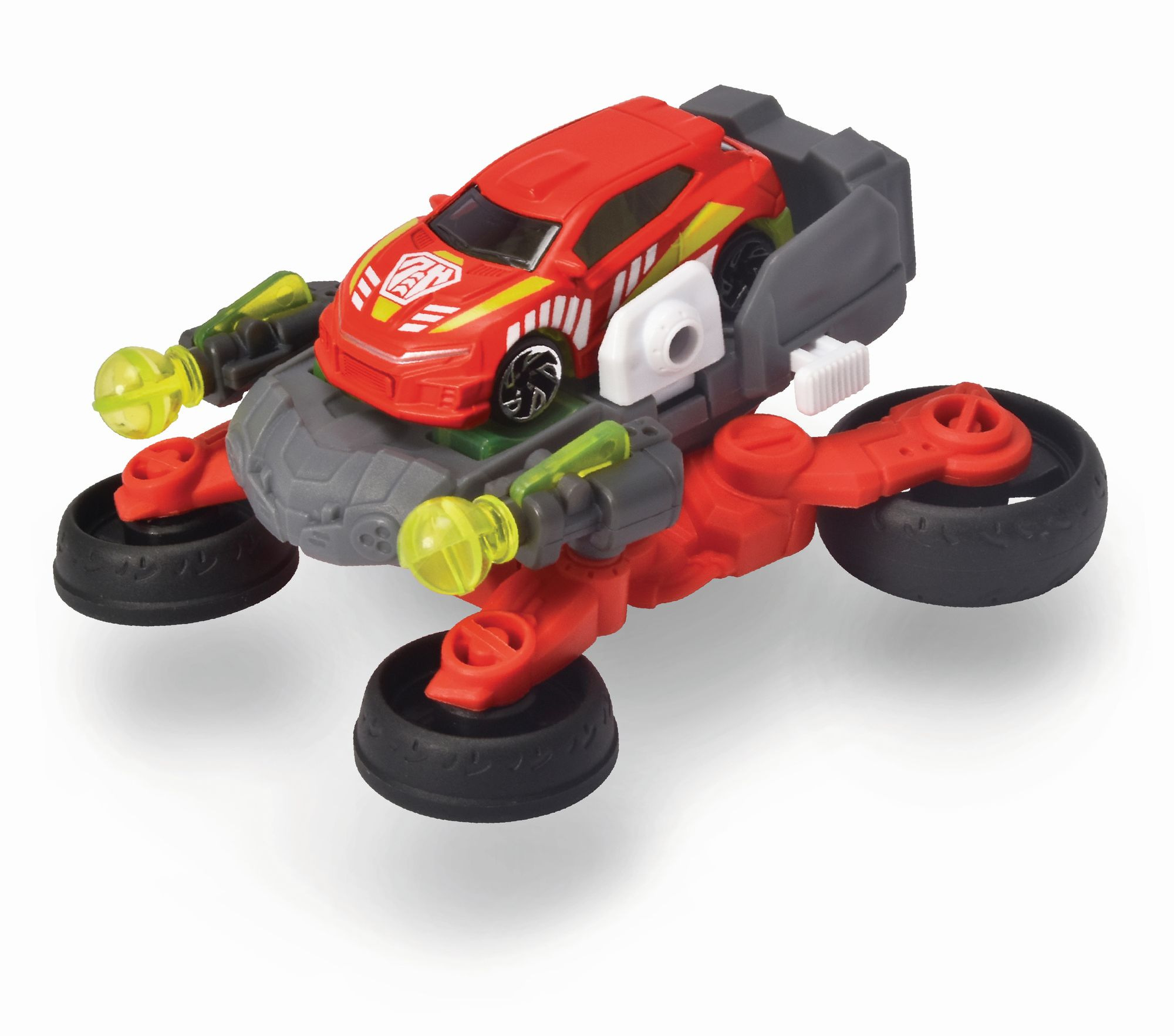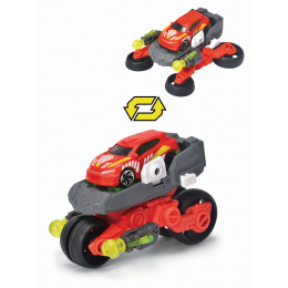 Skládací transformer vozidlo 2 v 1 - motocykl a dron je hlídkou na zemi i ve vzduchu a zajišťuje bezpečnost ve městě. Jediným pohybem se bleskově rychlý motocykl promění v drona. Včetně kovového autíčka (7,5 cm) na palubě, které lze připevnit a sejmout pomocí klipsu. Auto lze ručně přeměnit na robota. Aby se hybridní vozidlo ubránilo blížícím se útočníkům, má 2 střelná ramena, která lze ovládat ručně, ať už na zemi nebo ve vzduchu. Zařízení do auta a střely jsou kompatibilní s jinými vozidly nebo upínacími bloky. V měřítku 1:64. Výška 12 cm.