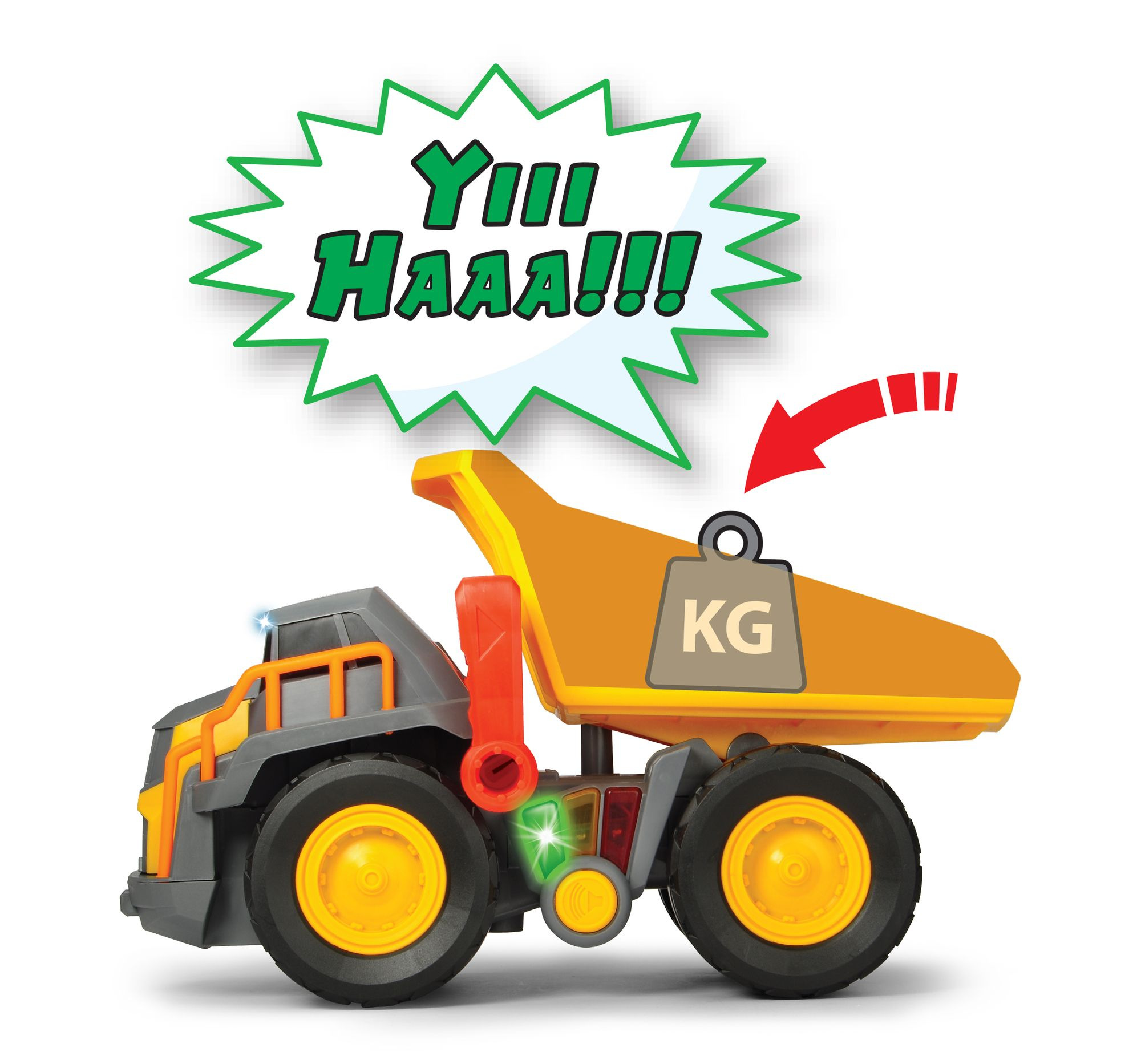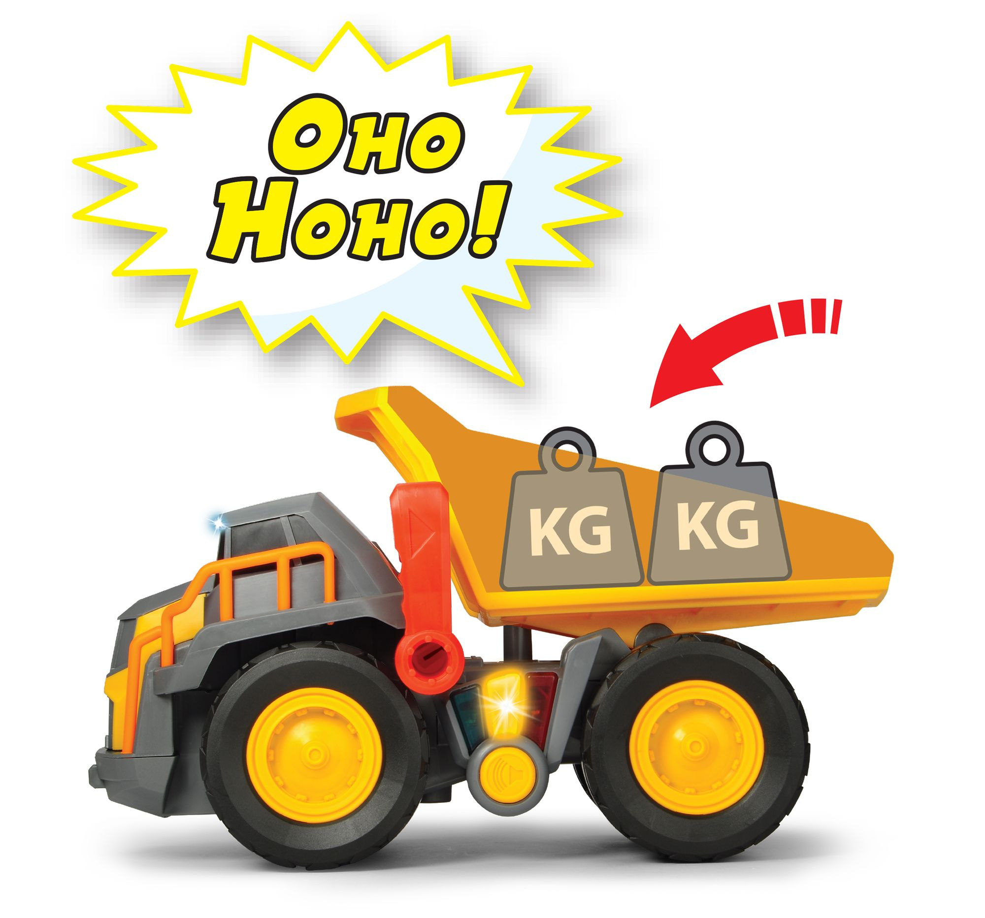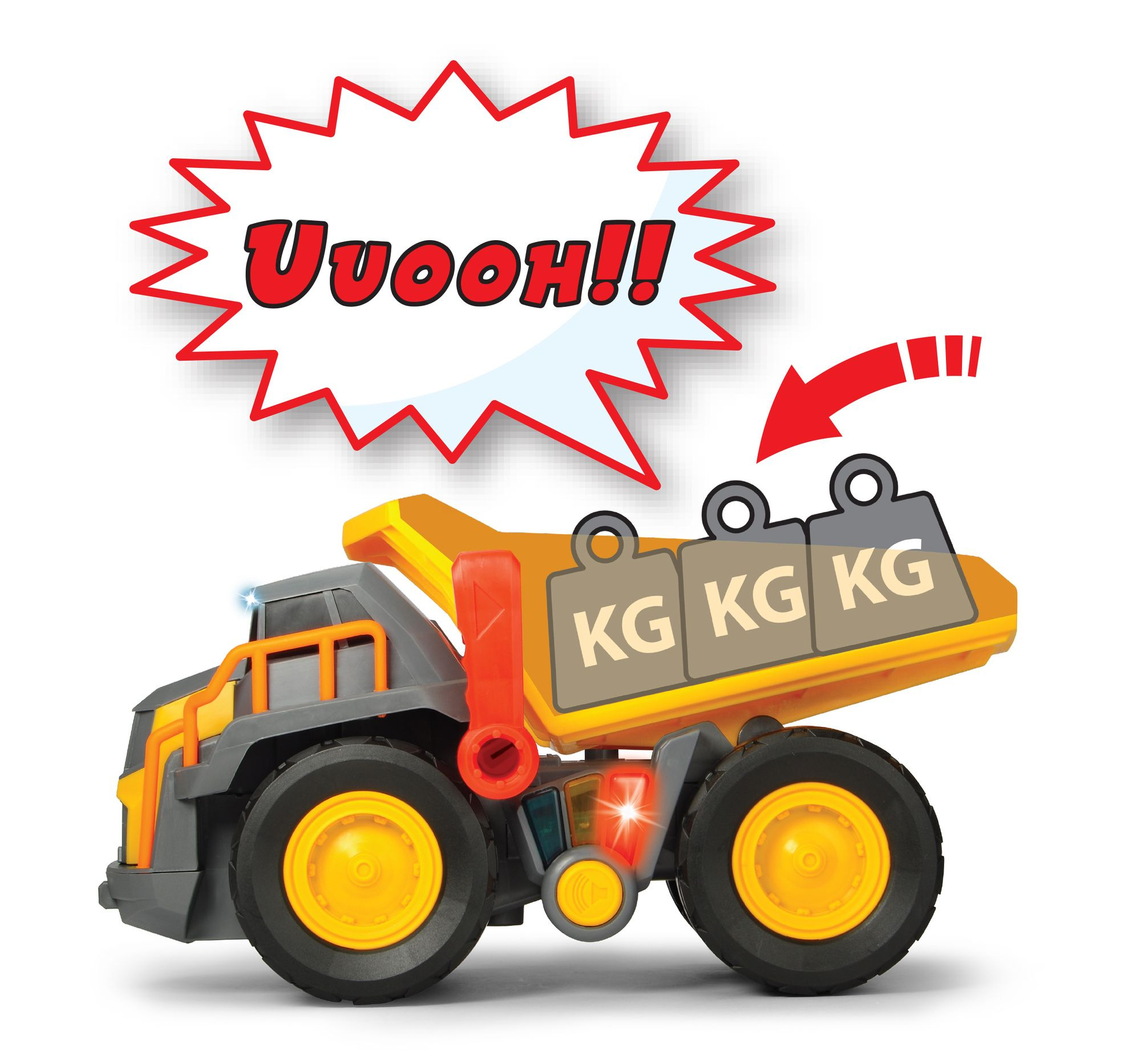 Volvo Radlader mit großen Rädern im Leerlauf, Sound- und Lichteffekte, beweglicher Laderaum, erkennt 3 verschiedene Gewichte. Größe 30 cm.