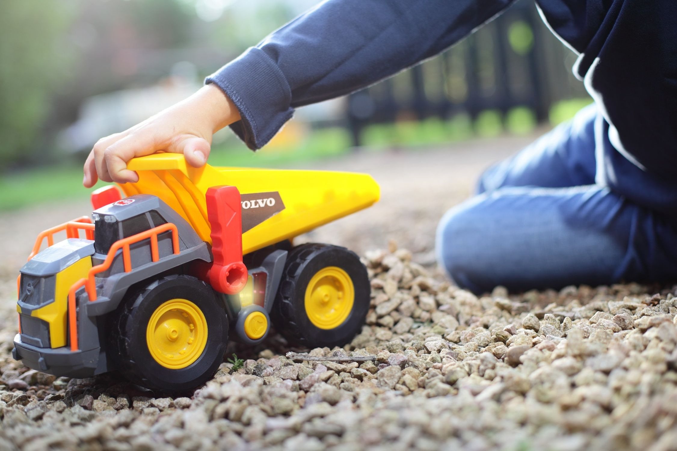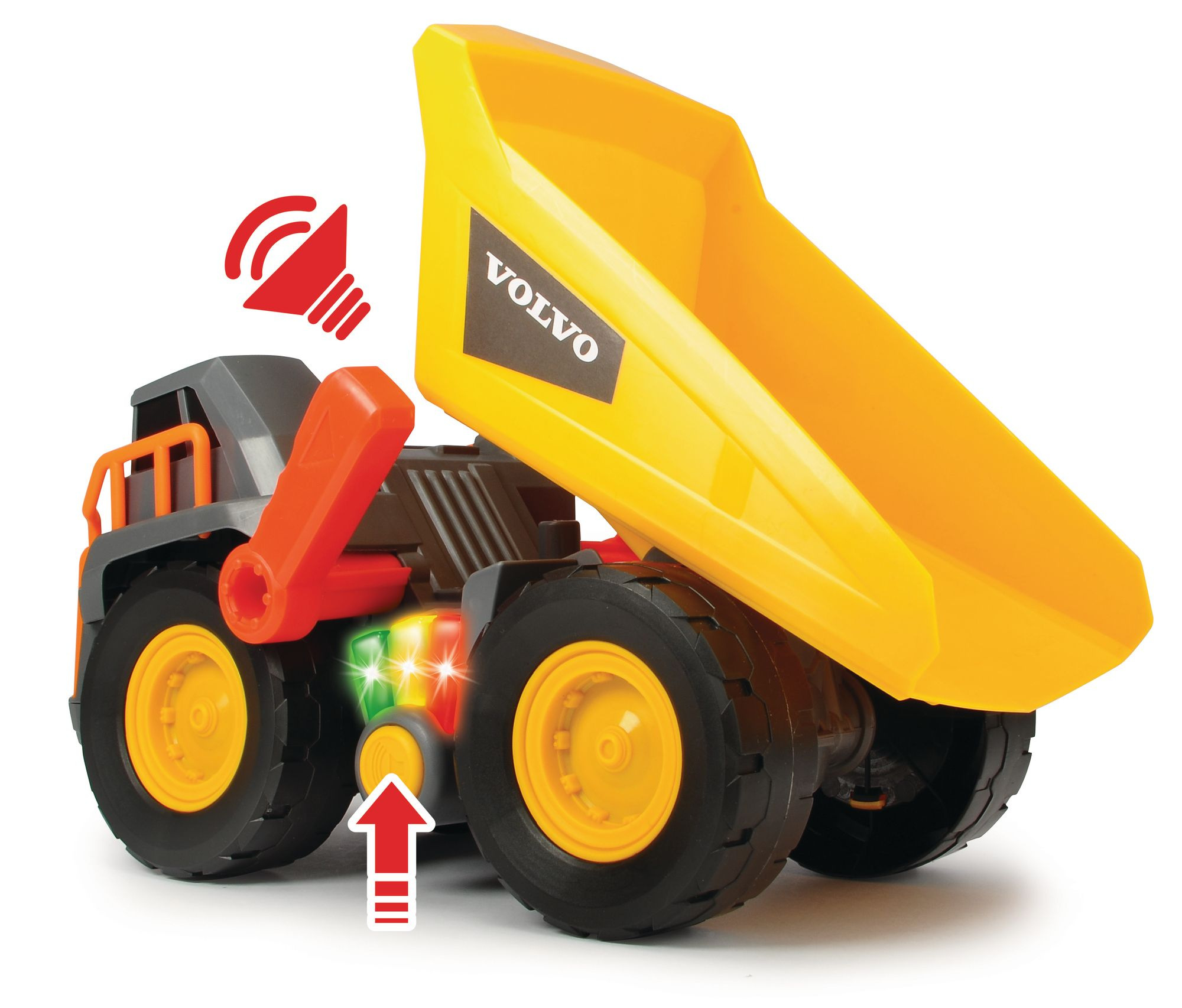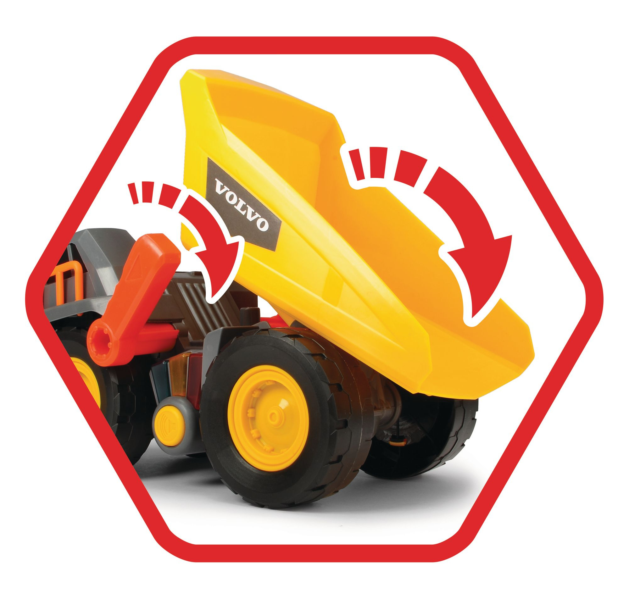 Volvo Radlader mit großen Rädern im Leerlauf, Sound- und Lichteffekte, beweglicher Laderaum, erkennt 3 verschiedene Gewichte. Größe 30 cm.