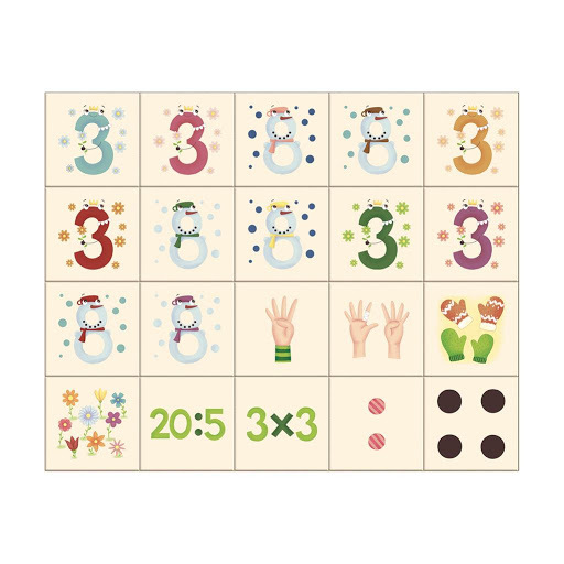 20 Würfel mit Zahlen und Zeichen, originell\nillustriert von der tschechischen Illustratorin Petra\nVybíhalová. Erstellung von Beispielen auf unterhaltsame Weise.\nIn der Verpackung finden Sie 12 Beispielaufgaben und 20\nBilder zum Zuordnen mit Zahlen.