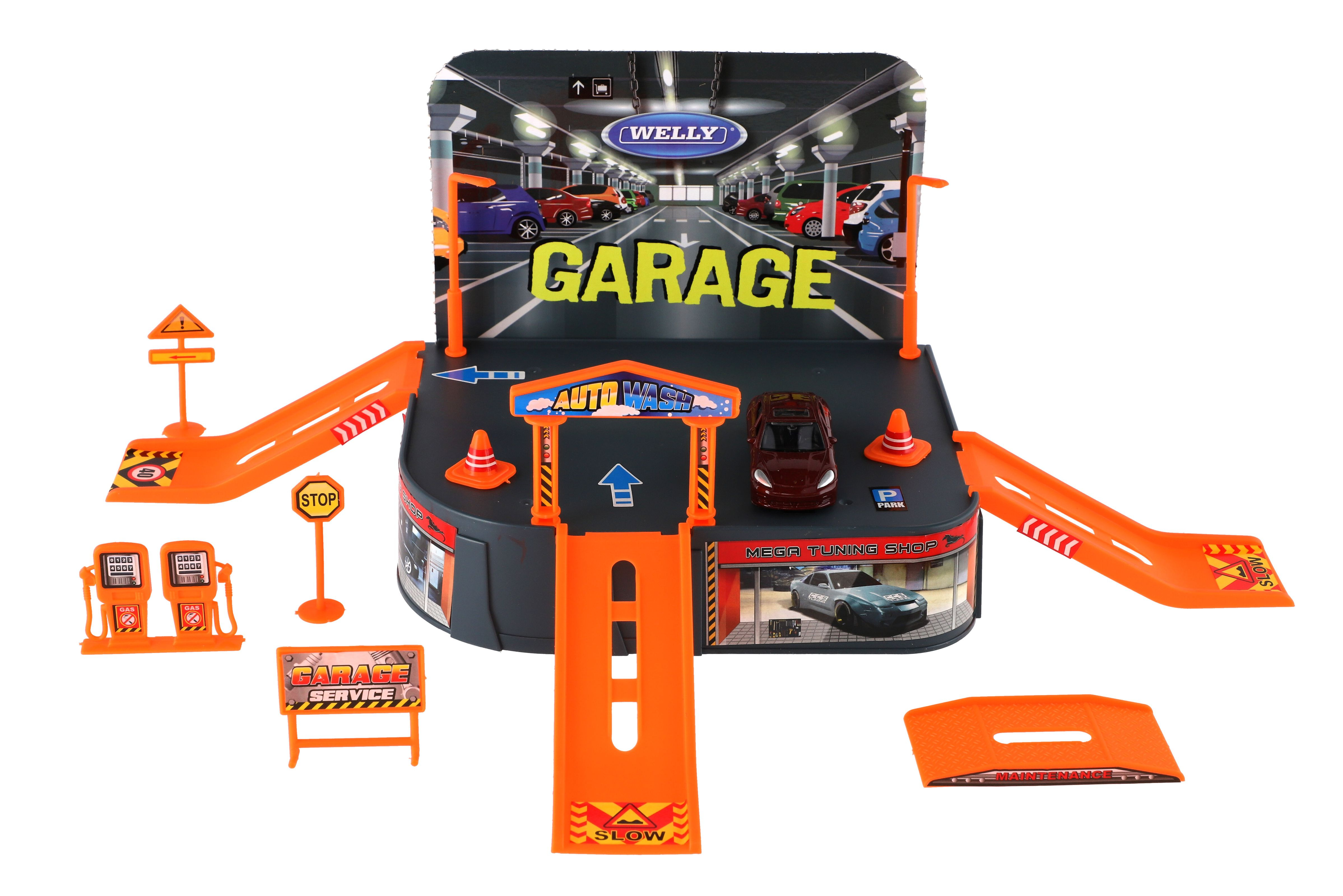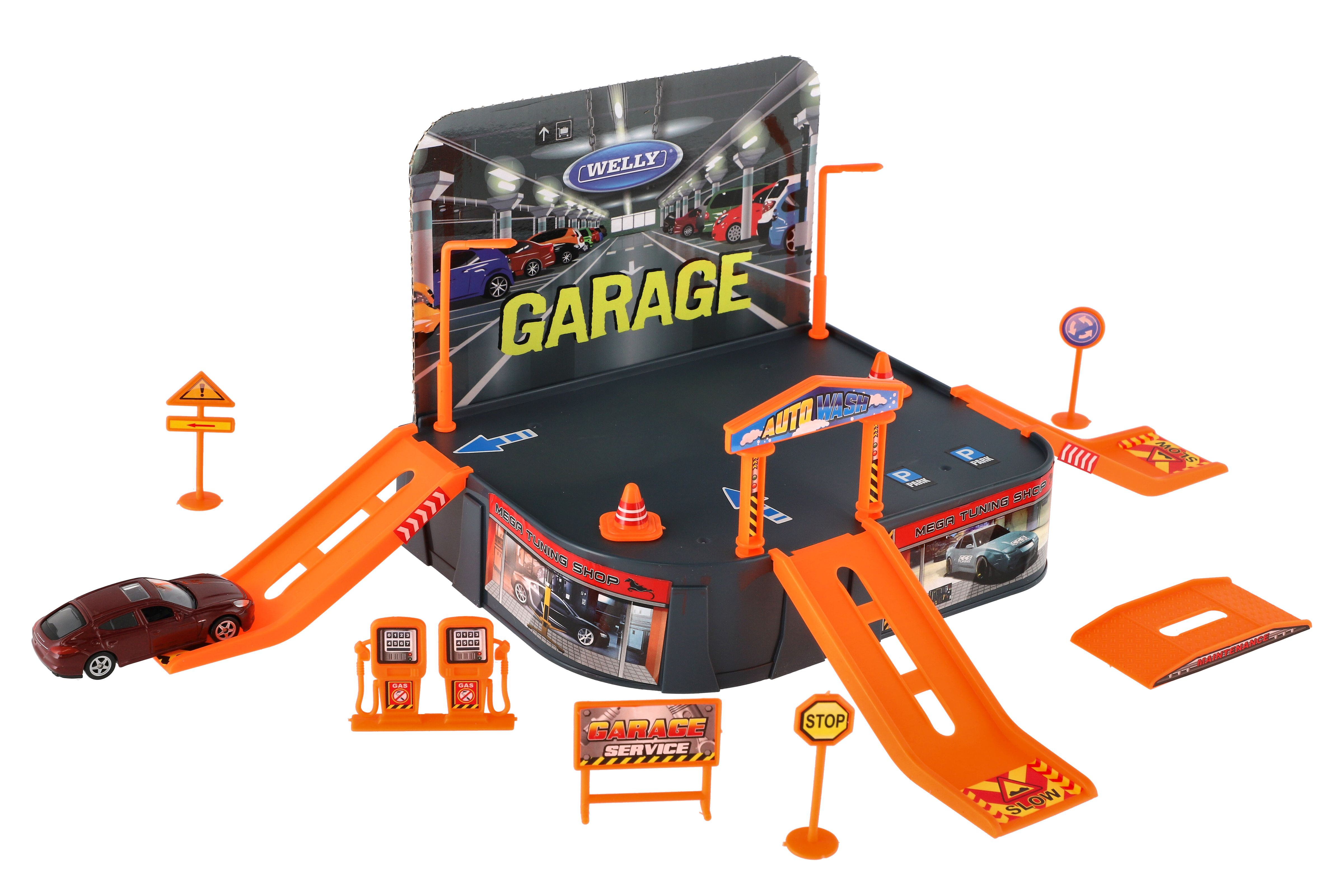 Nemá kam Váš řidič zaparkovat svá autíčka? Pořiďte mu tuto garáž a už nebudete mít problém se zaparkováním. Balení obsahuje skládací garáž, tankovací pumpu, nájezdy, značky... Všechny díly si polepí samolepkami, které jsou součástí balení. Balení obsahuje i auto Welly Porsche. Rozměr krabice: 21 x 25 x 5,5 cm Vhodné od 3 let