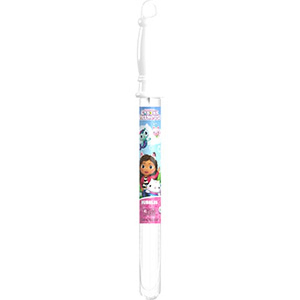 Seifenblasenmaschine mit Gabby's Dollhouse-Motiv, 120 ml Fassungsvermögen. Im bunten Deckel sind ein Spiel und ein Gebläse enthalten.