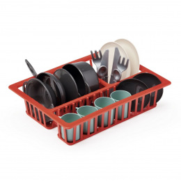 Velká průhledná taška se zipovým zavíráním obsahuje čtyři talíře, sadu čtyř příborů, čtyři pohárky, čtyři plastové hrníčky s podšálky, konvičku, cukřenku, síto a hrnec s pokličkou. Vše plastové. Vhodné pro děti od 18 měsíců. Velikost tašky 29x12x30 cm.