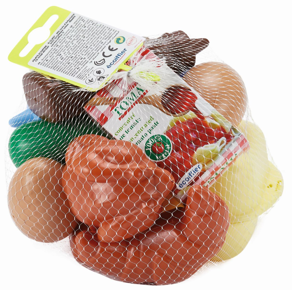 Modelle verschiedener Lebensmittel in einem Netz. Mit diesem Set haben Sie alle Zutaten für das perfekte Frühstück. Enthält eine Packung Eier und 2 Eier, Hühnchen, Wurst, Karotte, Gurke, Croissant, Tomatensoße und Toppings. Ideal auch als Kaufladenausstattung oder als Ergänzung für eine Kinderküche. Produktabmessungen (L x B x H): 19 x 19 x 13 cm.