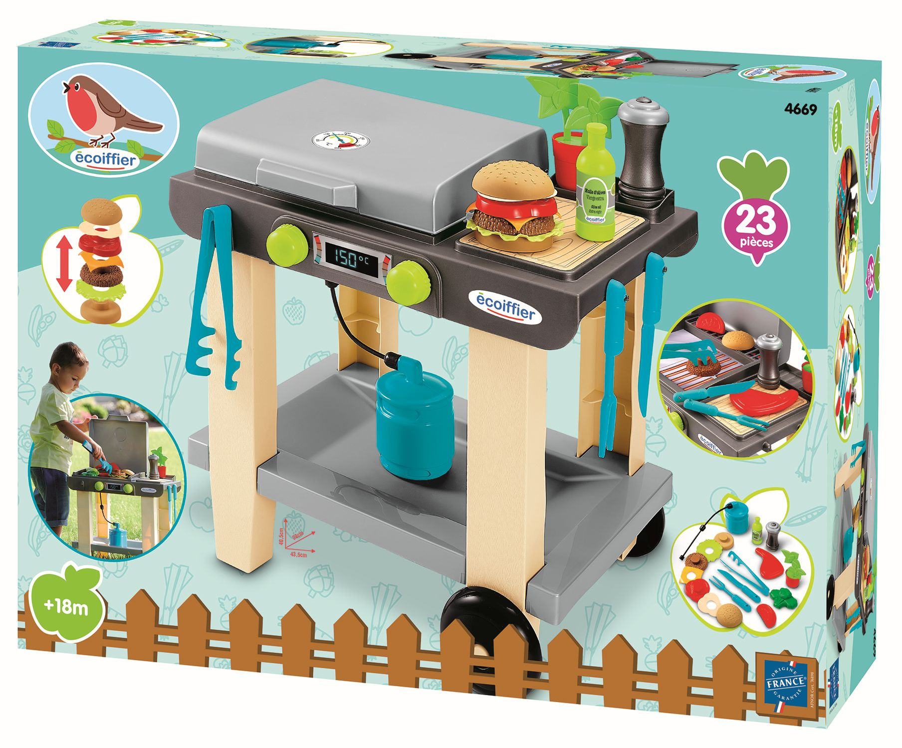 Gasgrill mit Deckel, Tischchen auf Rädern und viel Zubehör: Lebensmittelattrappen, Gasflasche, Salzstreuer, Olivenöl, Basilikum im Topf und Geschirr zum Kochen und Schneiden. Abmessungen: 43,5 x 59 x 28 cm (offen), 43,5 x 40,5 x 28 cm (geschlossen).