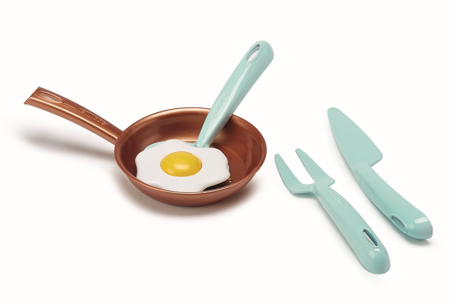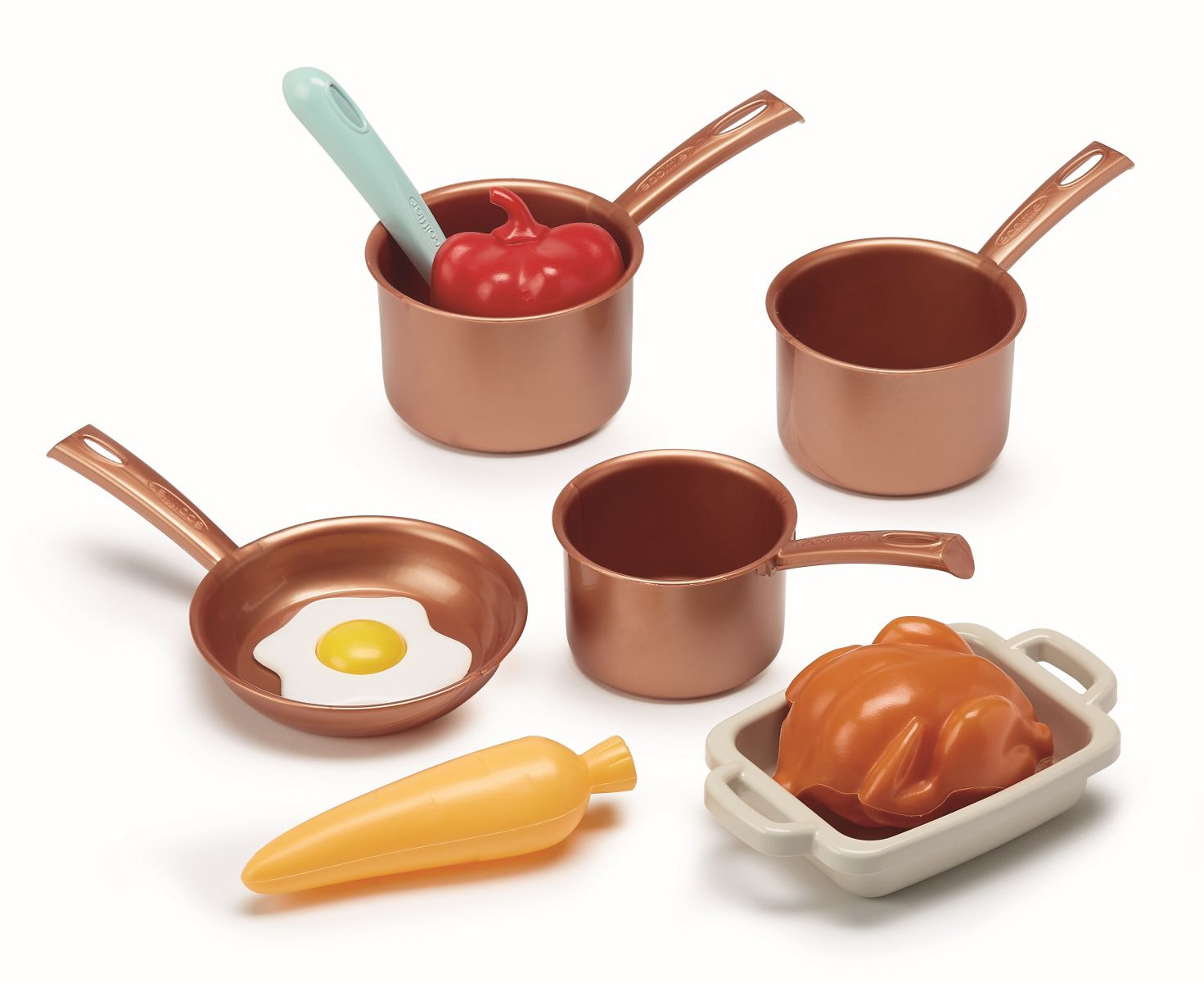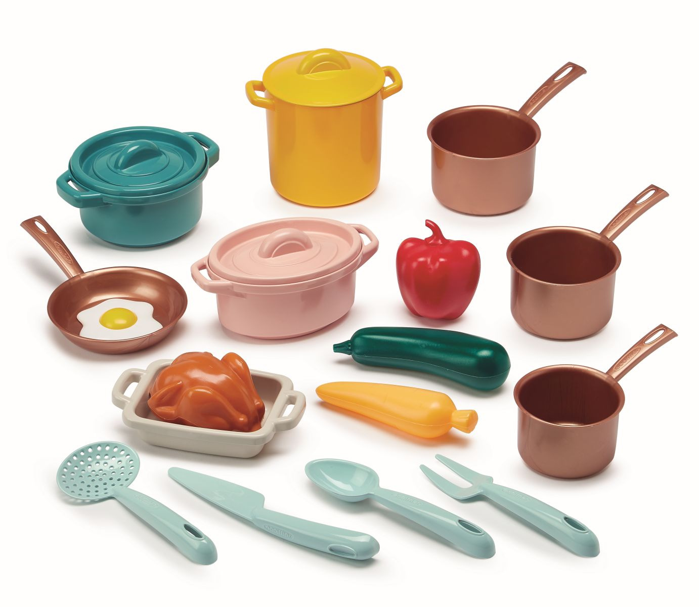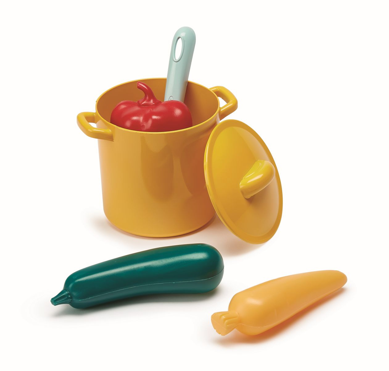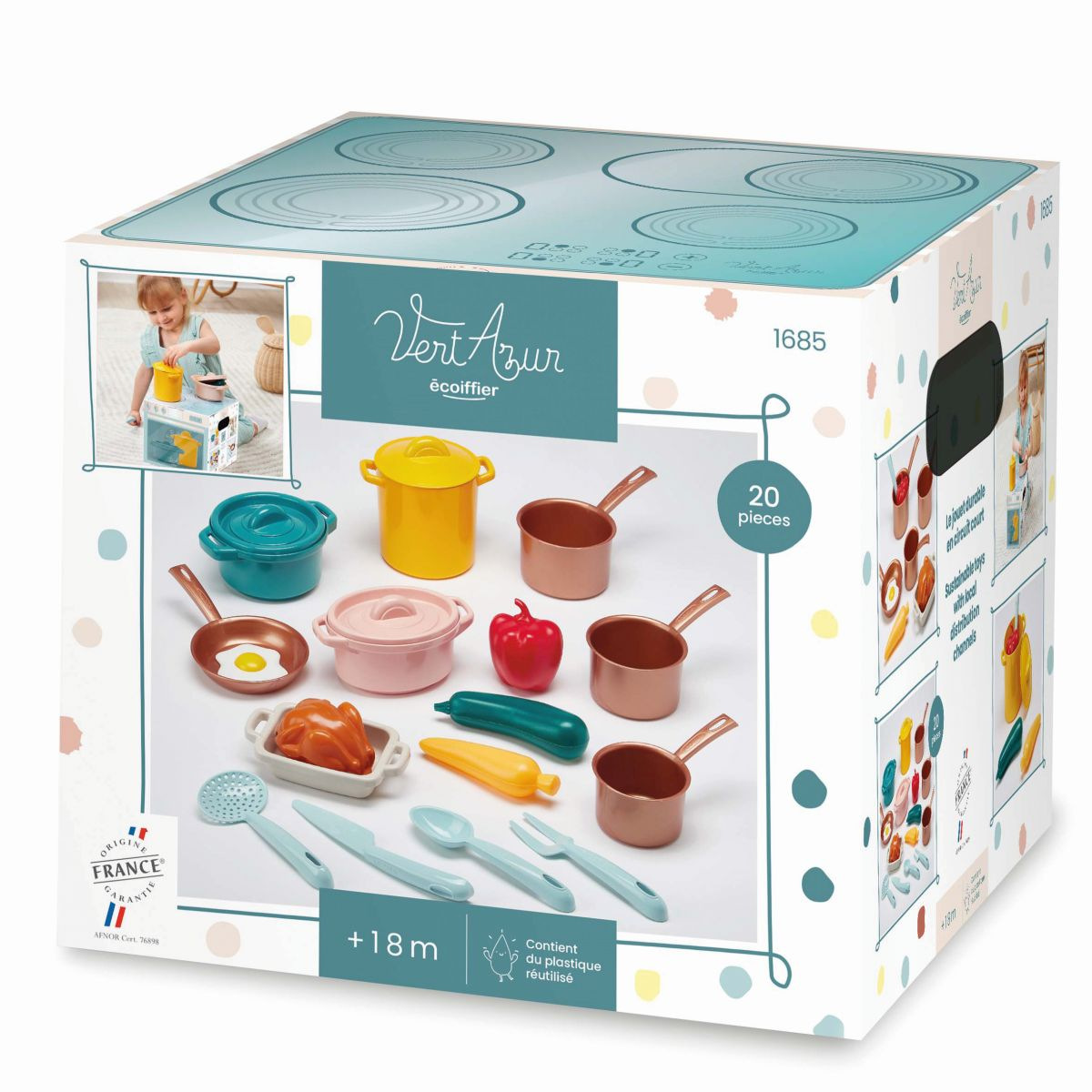 Eine große Auswahl an Geschirr, Lebensmitteln und Fertiggerichten. Die Box dient gleichzeitig als Herd. Es enthält insgesamt 20 Teile.