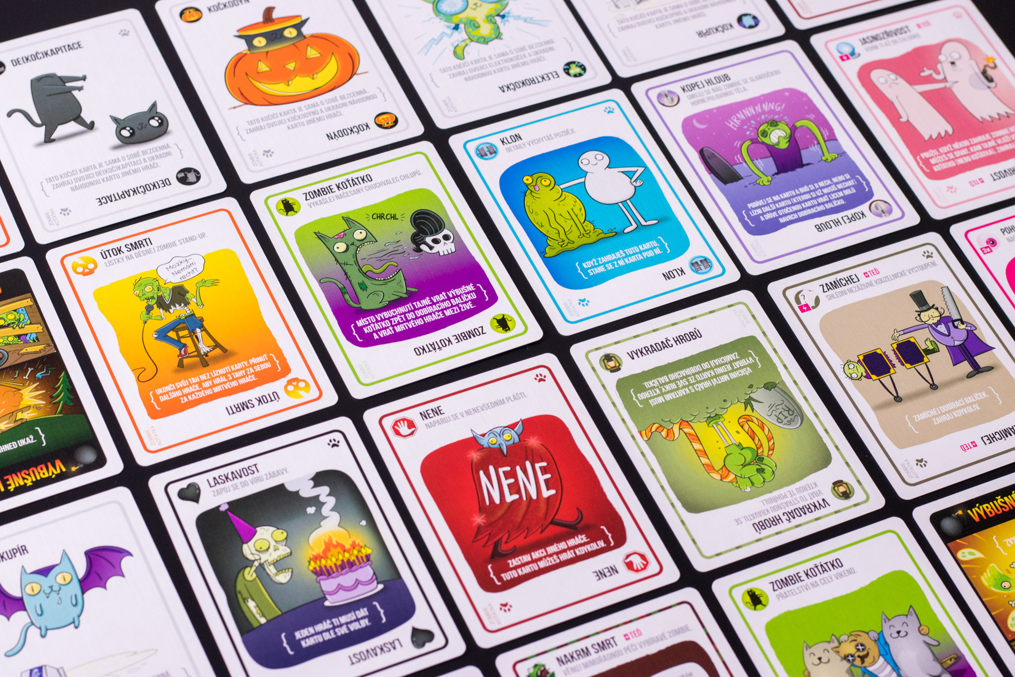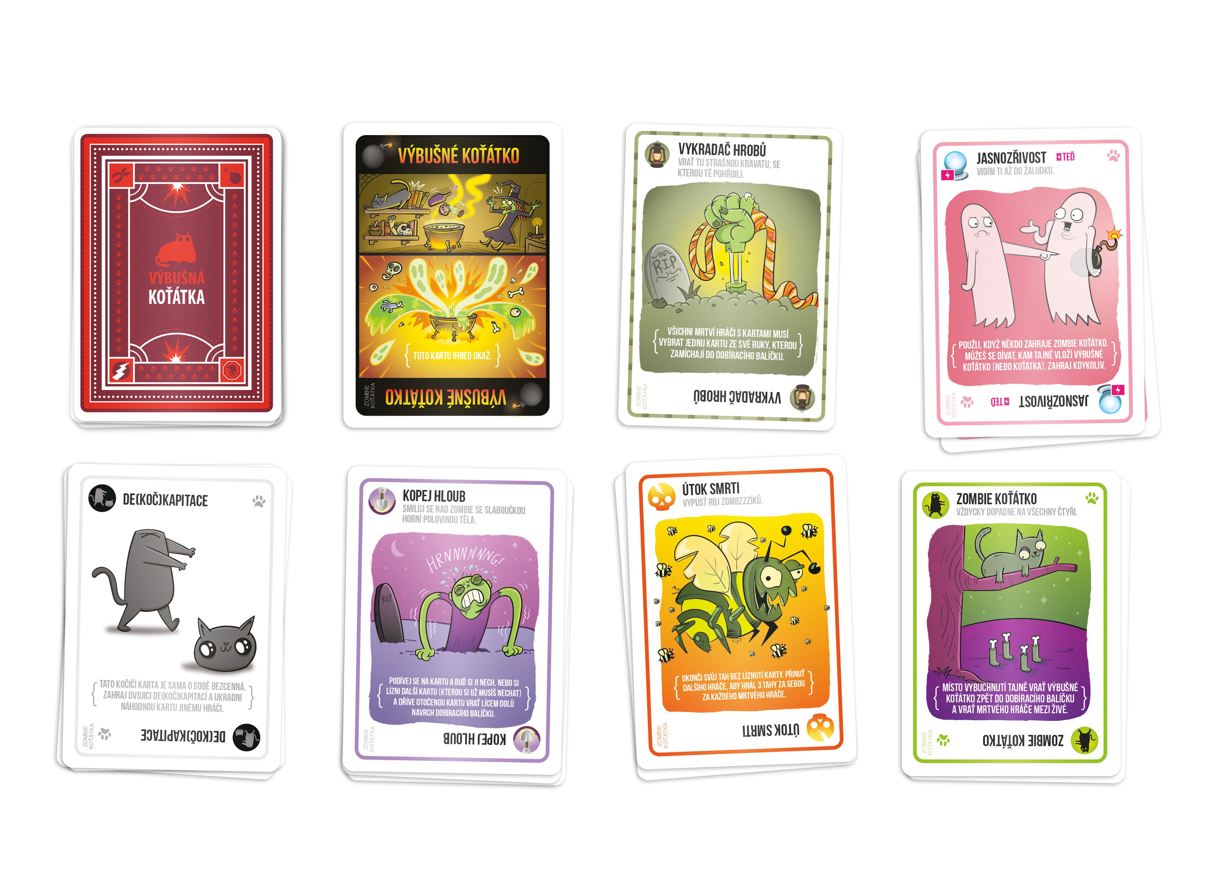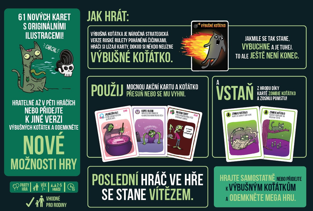 61 neue Karten mit Originalillustrationen erwarten Sie. Freut euch auf Karten mit den einprägsamen Namen „Feed Death“ oder „Dig Deeper“, die größte Bombe ist aber definitiv das Zombiekätzchen, das einen toten Spieler zurück ins Spiel bringt! Der letzte Spieler, der im Spiel übrig bleibt, ist jedoch der Gewinner!