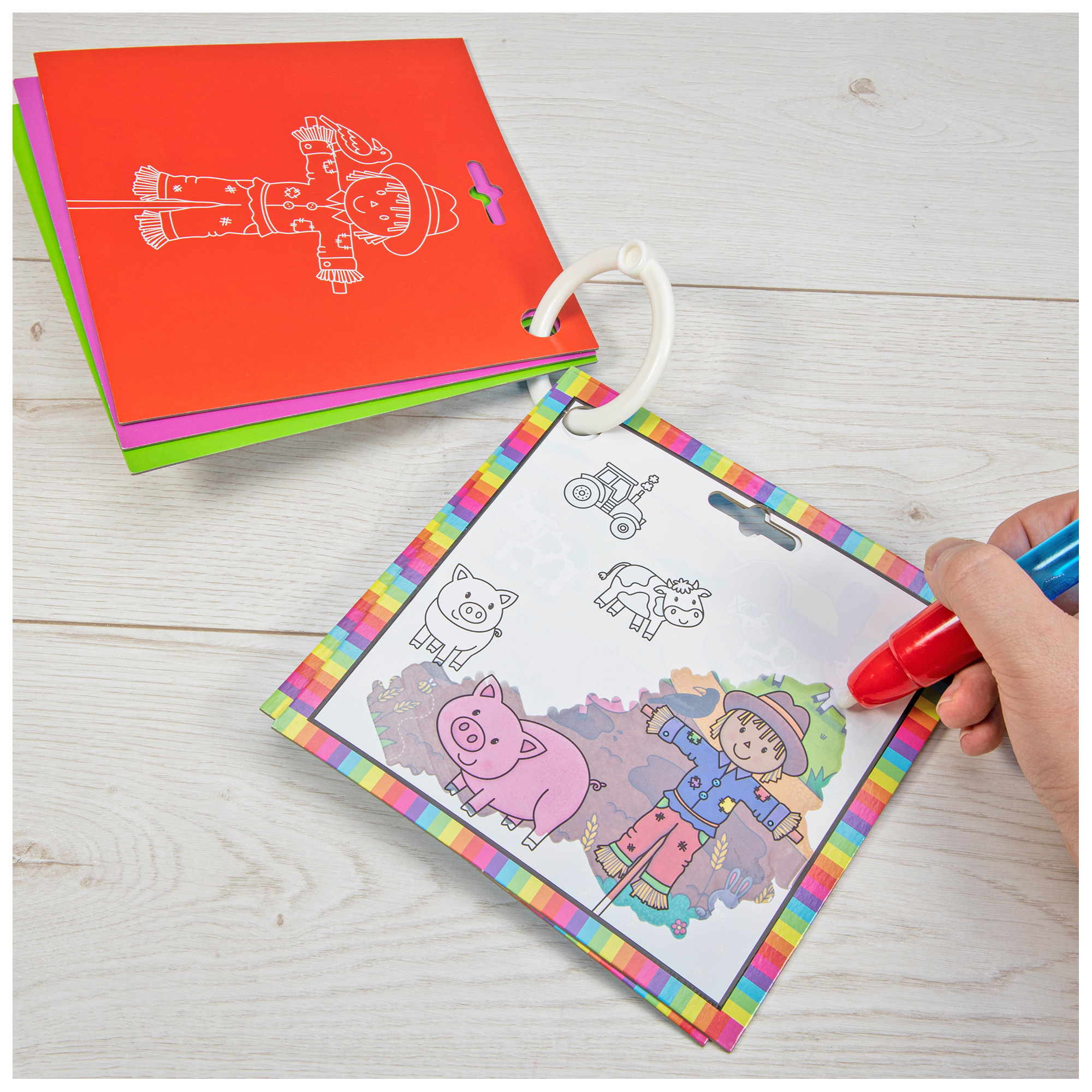 Sada kouzelných omalovánek Vodní magie pro nejmenší s opakovaně použitelnými obrázkovými deskami na pevném očku a novým velkým vodním perem. Tyto zábavné omalovánky obsahují opakovaně použitelné obrázky, které se vybarví vodním perem. Naplníme pero vodou a jeho pomocí pak dítě odkrývá schované obrázky mláďat domácích zvířátek. Obrázky se jako zázrakem vybarví a barvy pak zase zmizí, takže je děti mohou vybarvovat pořád dokola. Ideální pro cestování. Rozměry knížky: 265 x 180 x 180 mm