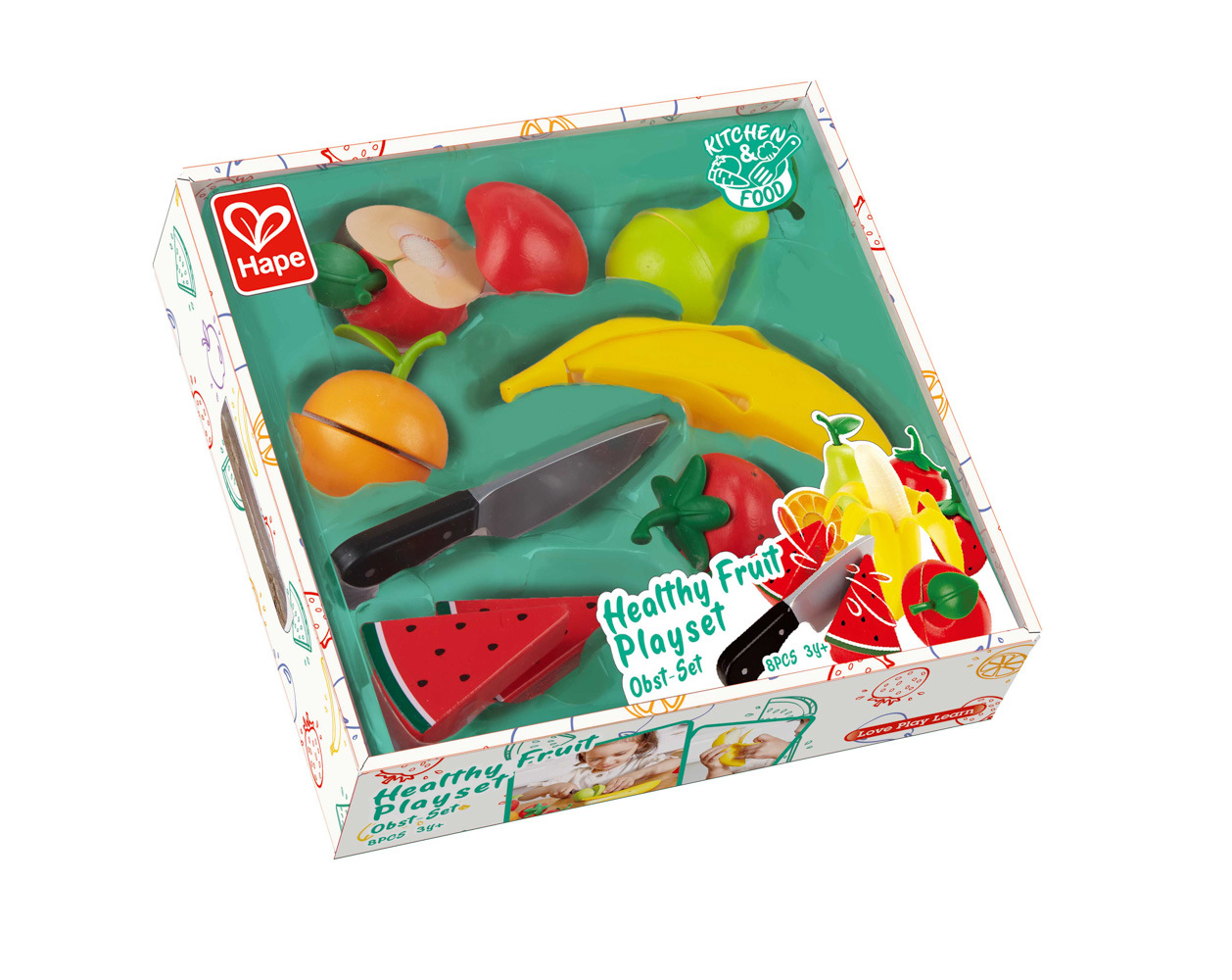 Tato nádherná hrací sada HAPE pomáhá dětem seznámit se s ovocem a inspiruje je k rozvoji zdravých stravovacích návyků. Povzbuďte v dětech zvědavost a nechte je rozvíjet jejich představivost, jazykové a sociální dovednosti hraním s touto nejkvalitnější realistickou sadou ovoce! Zkombinujte tuto sadu s dalšími potravinovými sadami a vytvořte zábavné hody. Hračka pomáhá s rozvojem jemné motoriky a koordinace ruka-oko. Pásky na suchý zip na plodech vydávají při krájení křupavý zvuk a banánová slupka je vyrobena z měkkého silikonu, takže ji mohou malé ručičky snadno loupat! Sada zdravého ovoce obsahuje dvě jahody, hrušku, pomeranč, jablko, dva kousky melounu, banán a realistický dětský hrací nůž. Rozměr balení: 25,5 x 6 x 24,5 cm. Věk: 3+
