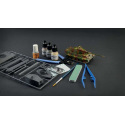 Balení obsahuje: Jeden plastový model s obtisky – Lepidlo na lepení plastu – 3 hlavní akrylové barvy (7 ml) - Štětec – Přesná pinzeta – Oboustranné brousítko – Kleštičky na vystřihování dílků