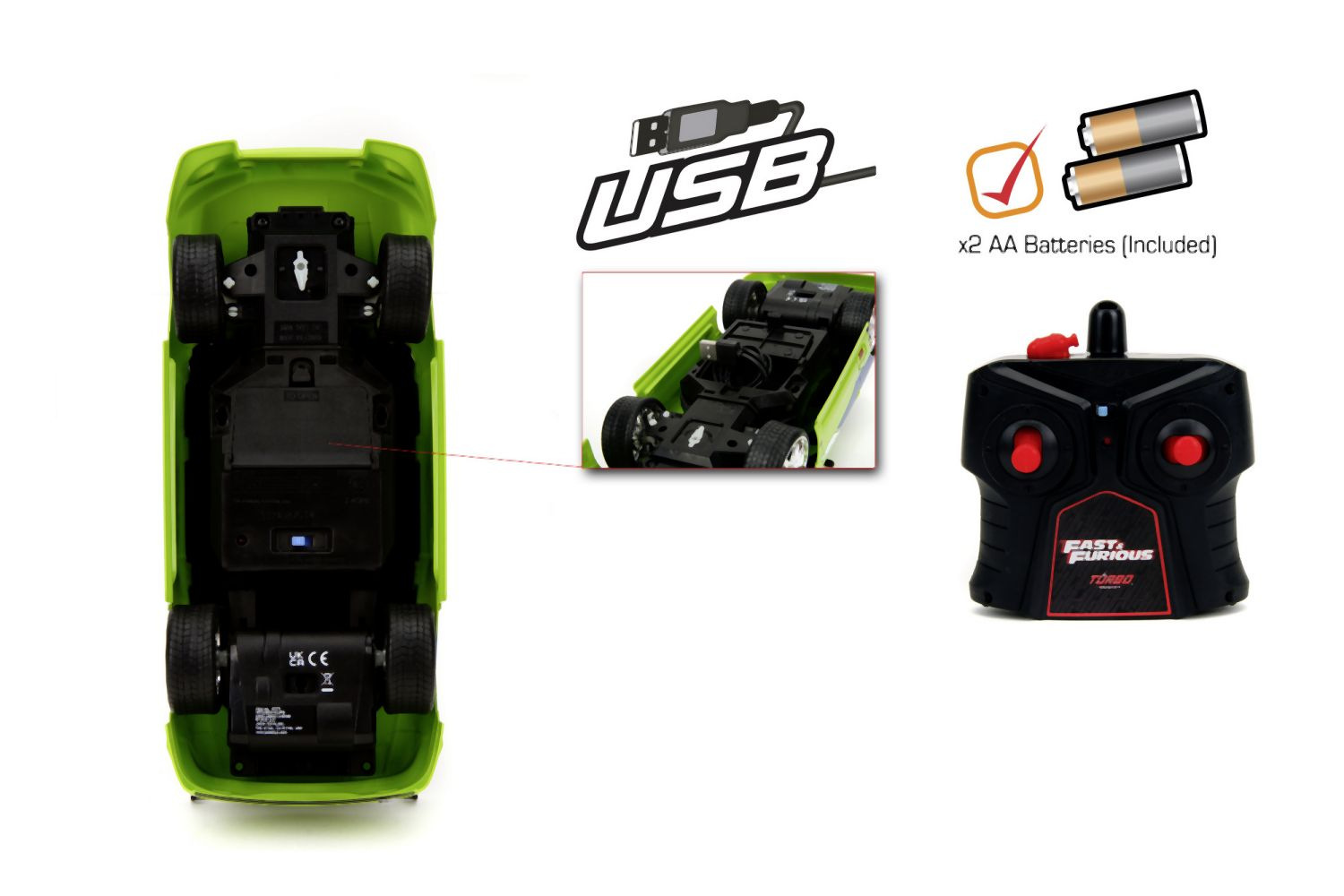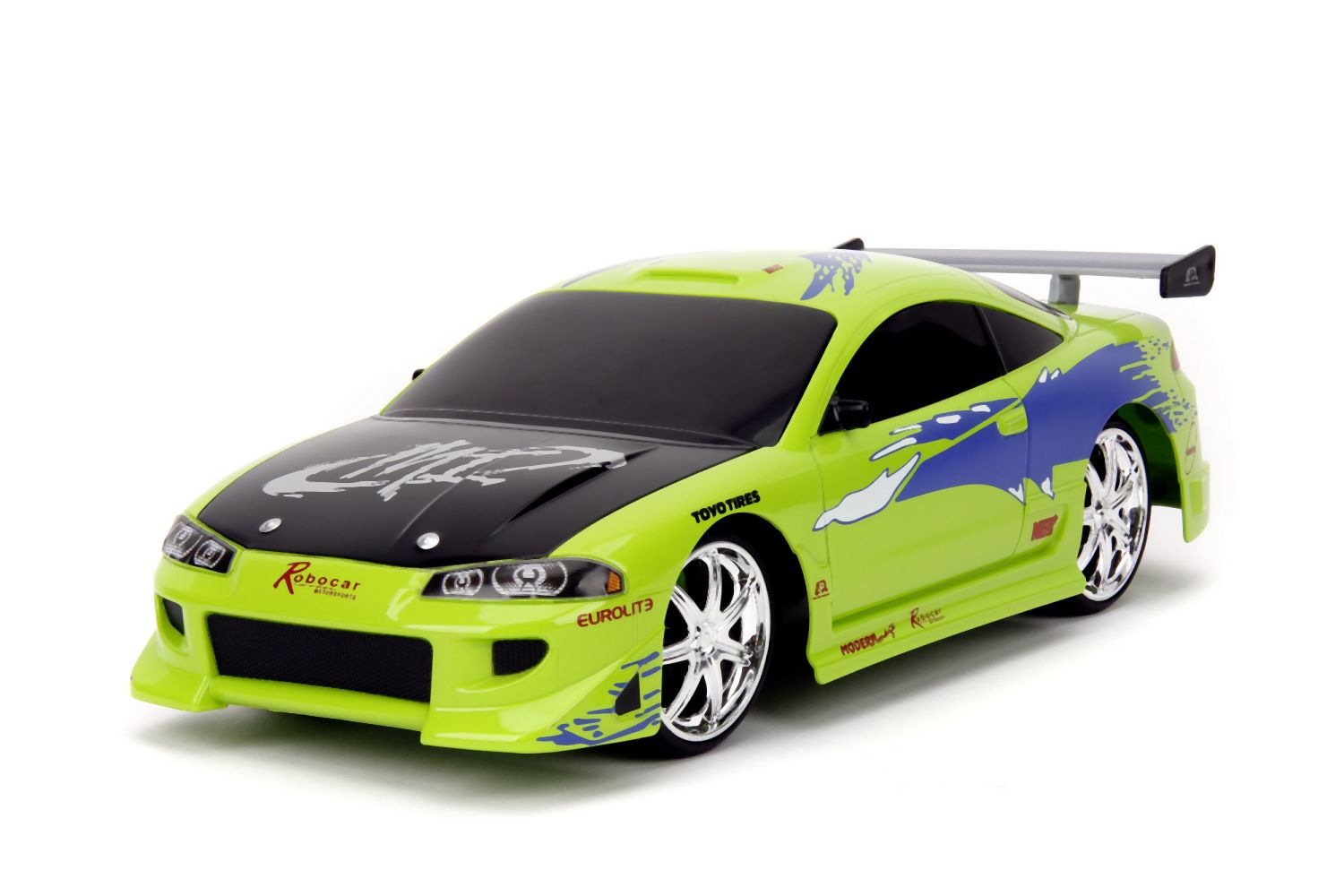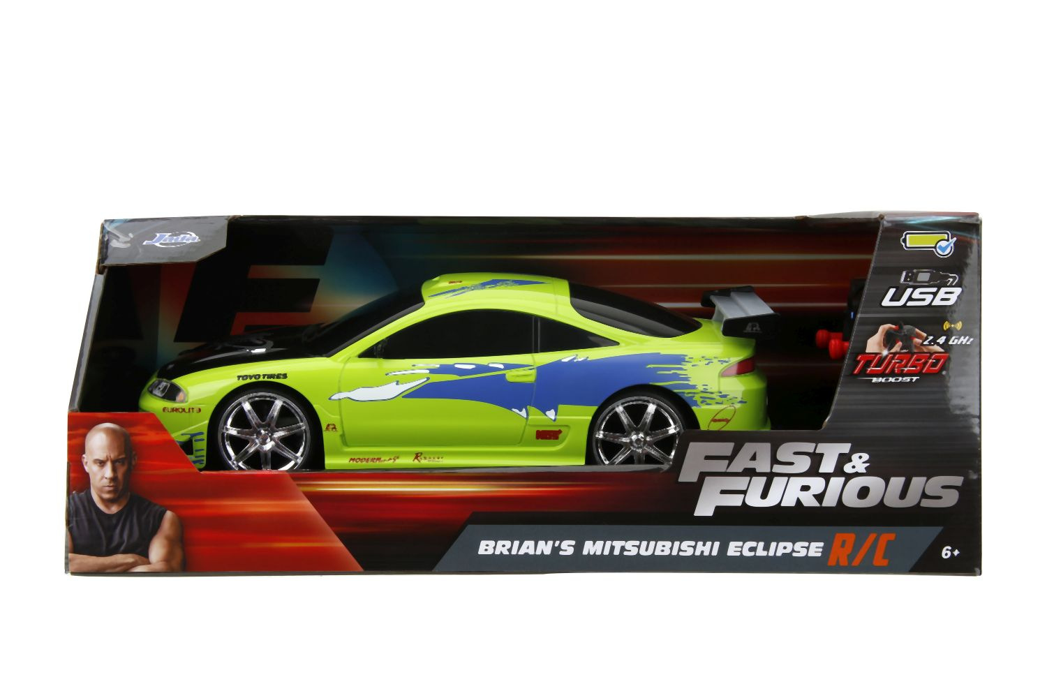 Auto 1995 Mitsubishi na dálkové ovládání z akčního filmu Rychle a zběsile. 2 kanály (jezdí vpřed, vzad, vlevo a vpravo). Frekvence 2,4 GHz. Turbo funkce. Barva zelená. Dobíjení prostřednictvím USB. V měřítku 1:16. Délka 28 cm.