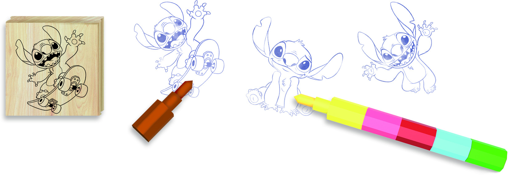 Beschreibung Jiri Models Stempel 3+1 mit Kissen Holz 4,5x4,5cm mit Wachsmalstift Lilo & Stitch auf Karte 17x28cm