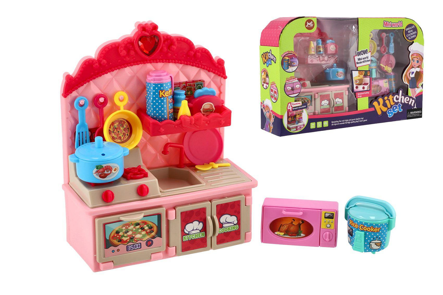 Výrobek obsahuje všechno zobrazené příslušenství. Má otočnou dřezovou baterii, otvírací dvířka a otočné knoflíky u elektrické i mikrovlnné trouby. Věk: 3+. Rozměr výrobku je : 78 x 105 x 33,5 cm. Vyška pracovní plochy: 55 cm.