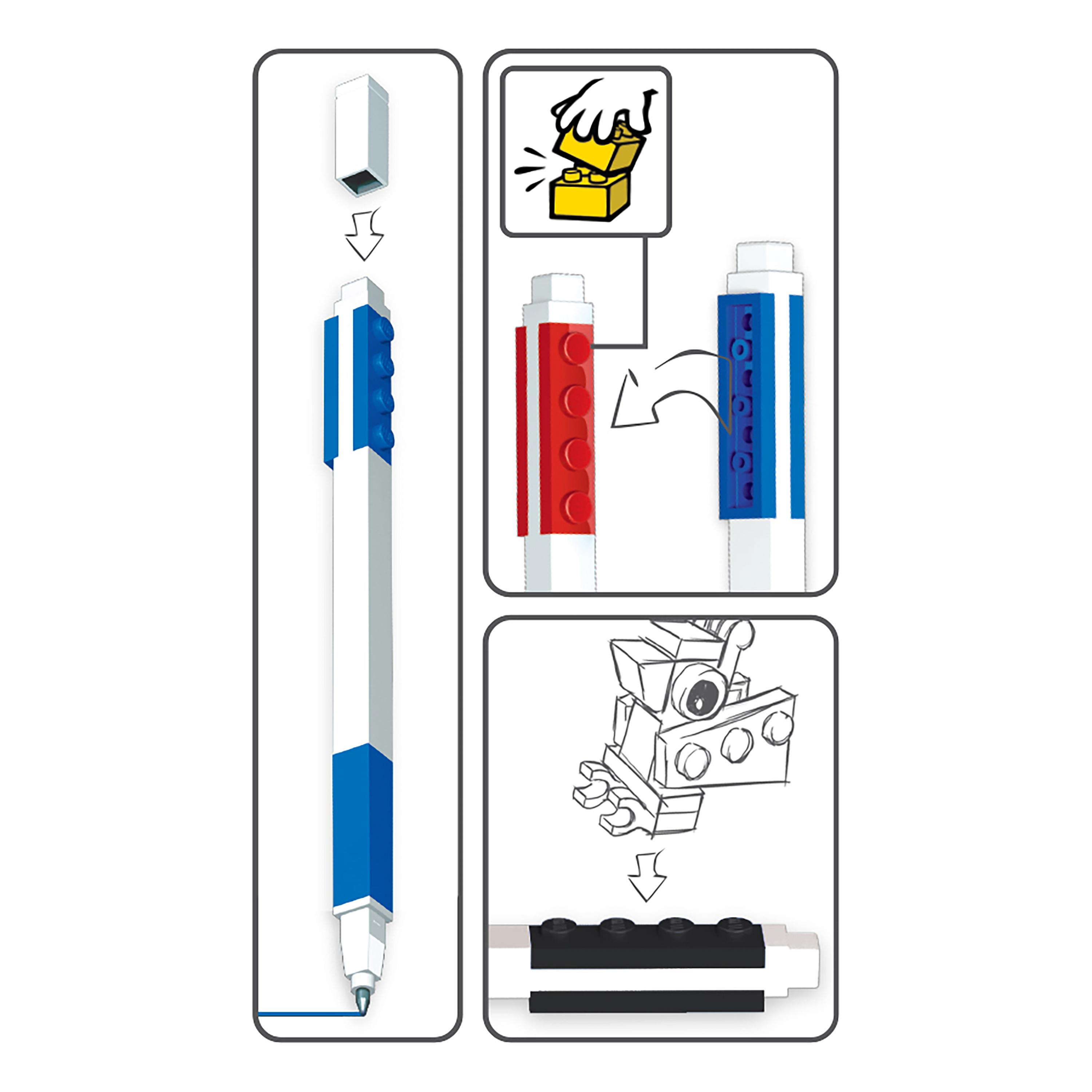 Trojice LEGO gelových per různých barev (červená, modrá, černá). Součástí pera jsou 2 proužky LEGO destičky pro spojení např. s LEGO pouzdrem, minifigurkou, jiným perem nebo k nacvaknutí na LEGO pravítko.