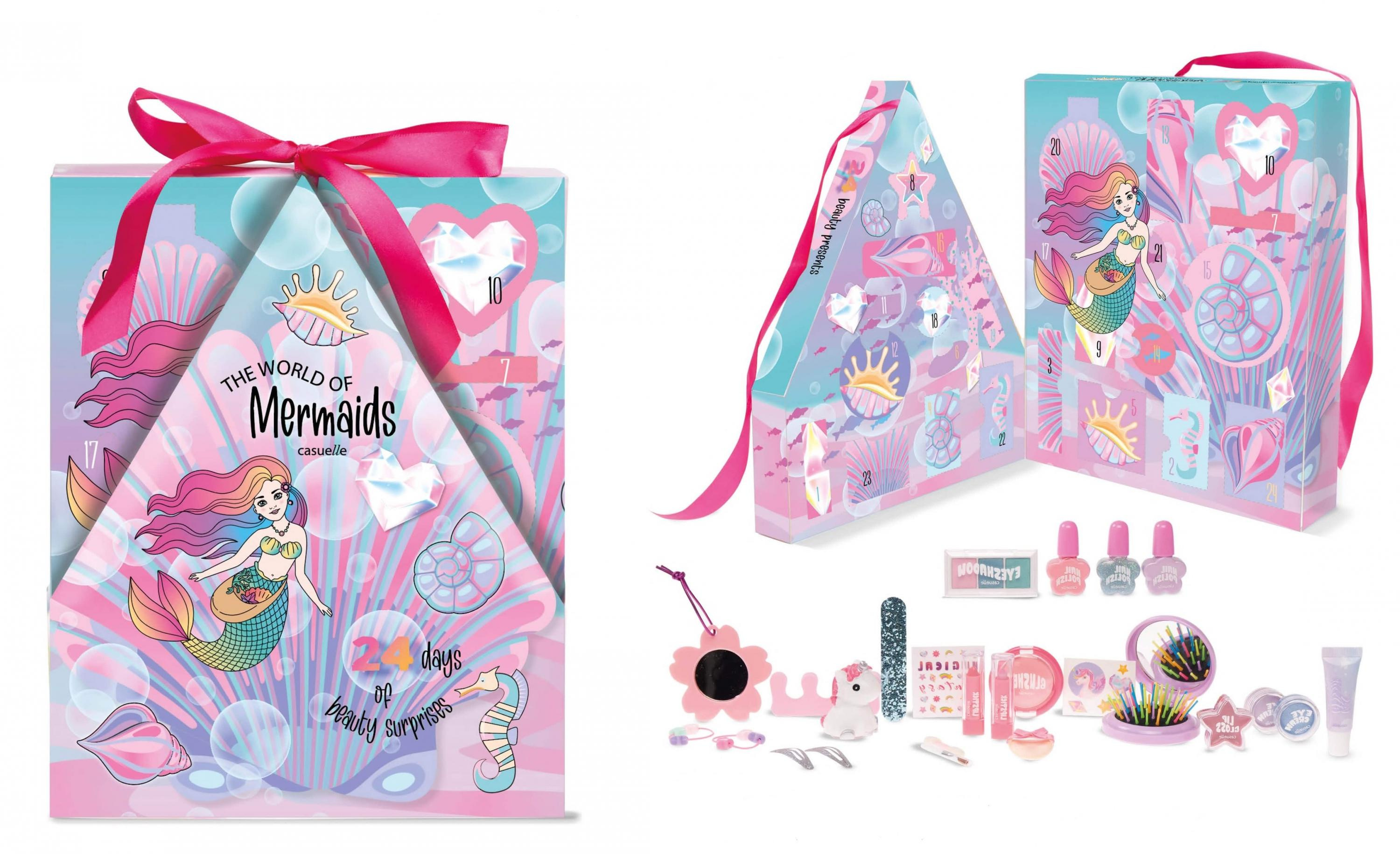 Každý den se vaše holčička může těšit na nové překvapení. Kalendář obsahuje vše, co potřebuje pro svou krásu – od barevných líčidel a zrcátka, přes hřebínek, sponky a gumičky do vlasů, až po samolepky a další doplňky.