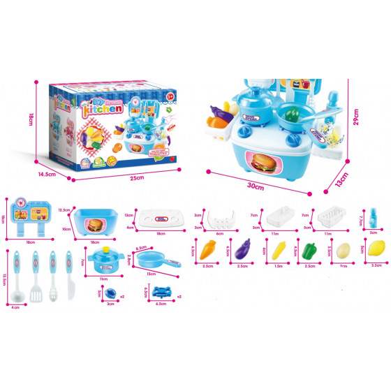 Eine Miniküche, in der Sie viele Leckereien zubereiten können. Küchenmaße 30x28x15 cm. Die Küchenzeile enthält kleines Geschirr, Kochutensilien, Lebensmittelmodelle und weiteres Zubehör.