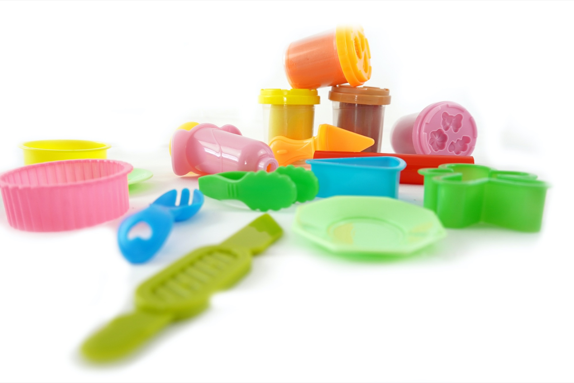 Knetmasse, in der sich verschiedene Ausstechformen und Förmchen zur Herstellung eines Hamburgers bef