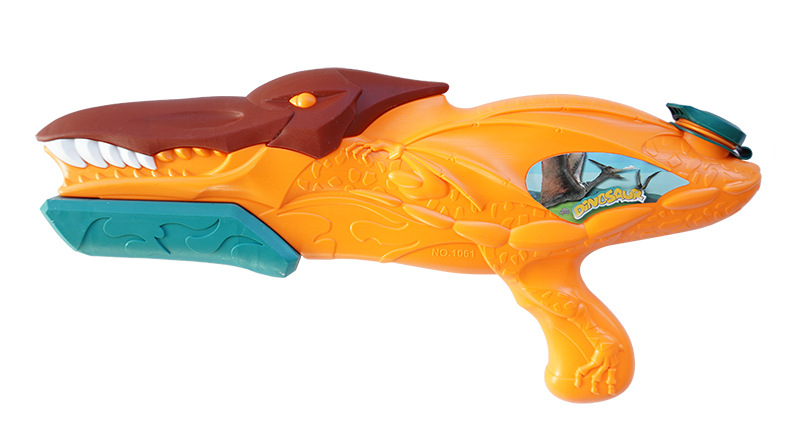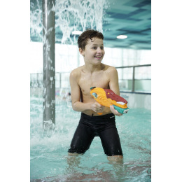 Vodní pistole ve tvaru dinosaura s nádobkou na vodu. Pistole je 40 cm velká.
