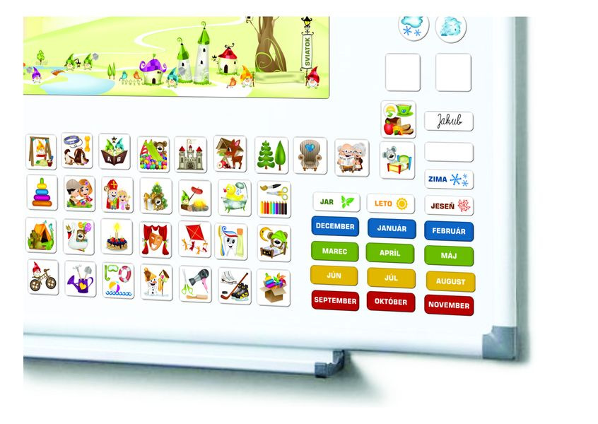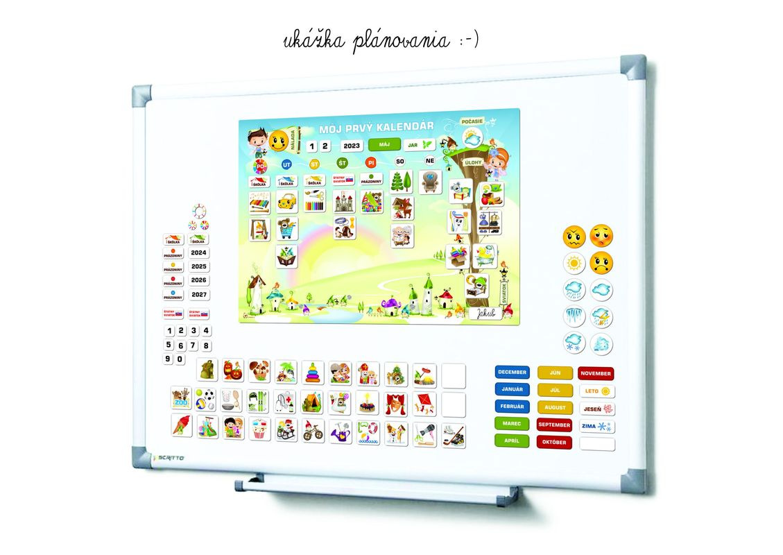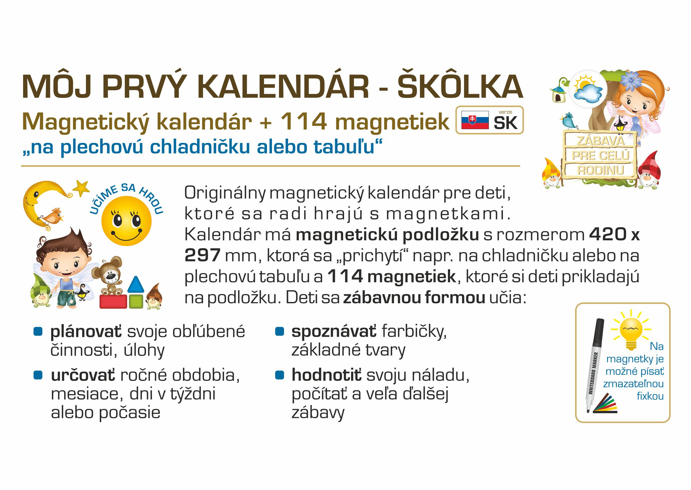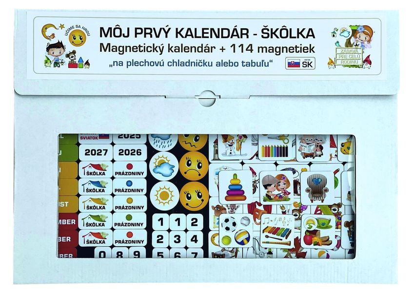 Ein origineller Magnetkalender für Kinder, die gerne mit Magneten spielen. Der Kalender verfügt über eine Magnetunterlage im Format 420 x 297 mm, die z.B. an einem Laptop oder Tablet „aufgeklebt“ wird. am Kühlschrank oder auf einem Blechteller und 114 Magnete, die die Kinder auf der Matte platzieren. Kinder lernen auf spielerische Weise: - ihre Lieblingsaktivitäten und -aufgaben planen - Farben und Grundformen kennenlernen - Jahreszeiten, Monate, Wochentage oder das Wetter bestimmen - ihre Stimmung einschätzen, zählen und vieles mehr. Liste der Magnete (114 Stück) – 12 Stück (Zahlen zum Bilden des Datums für den jeweiligen Tag) – Größe 20 x 20 mm – 12 Stück. Größe: Ringdurchmesser 25 mm - 1 Stück (Gestern x Morgen) - Größe: Ringdurchmesser 25 mm, 11 Stück (Feiertage) - Größe: 55 x 20 mm (weißer Magnet zum Beschriften des Namens) - 5 Stück (Kindergarten) - Größe: 40 x 20 mm (der farbige Baldachin ist der Farbe des jeweiligen Tages zugeordnet) - 5 Stück (Feiertage) - Größe: 40 x 20 mm (der farbige Baldachin ist der Farbe des jeweiligen Tages zugeordnet) - 3 Stück (Feiertage) - Größe: 40 x 20 mm - 5 Stück (Jahre: 2020 bis 2024) - Größe: 40 x 20 mm - 2 Stück (weiß - zum Bemalen eigener Aktivitäten) - Größe: 40 x 40 mm In einer Karte: 45 x 32 x 1 cm