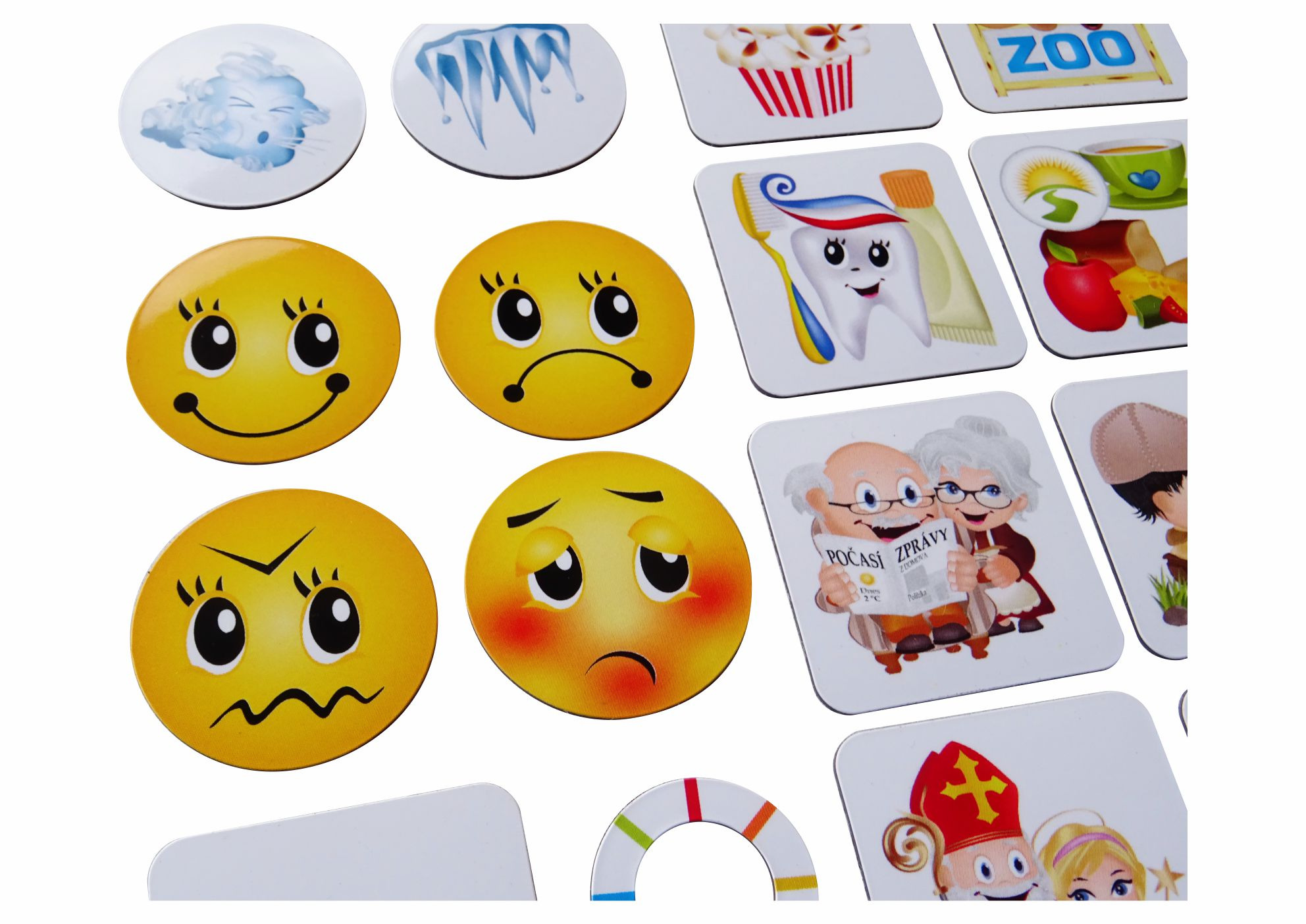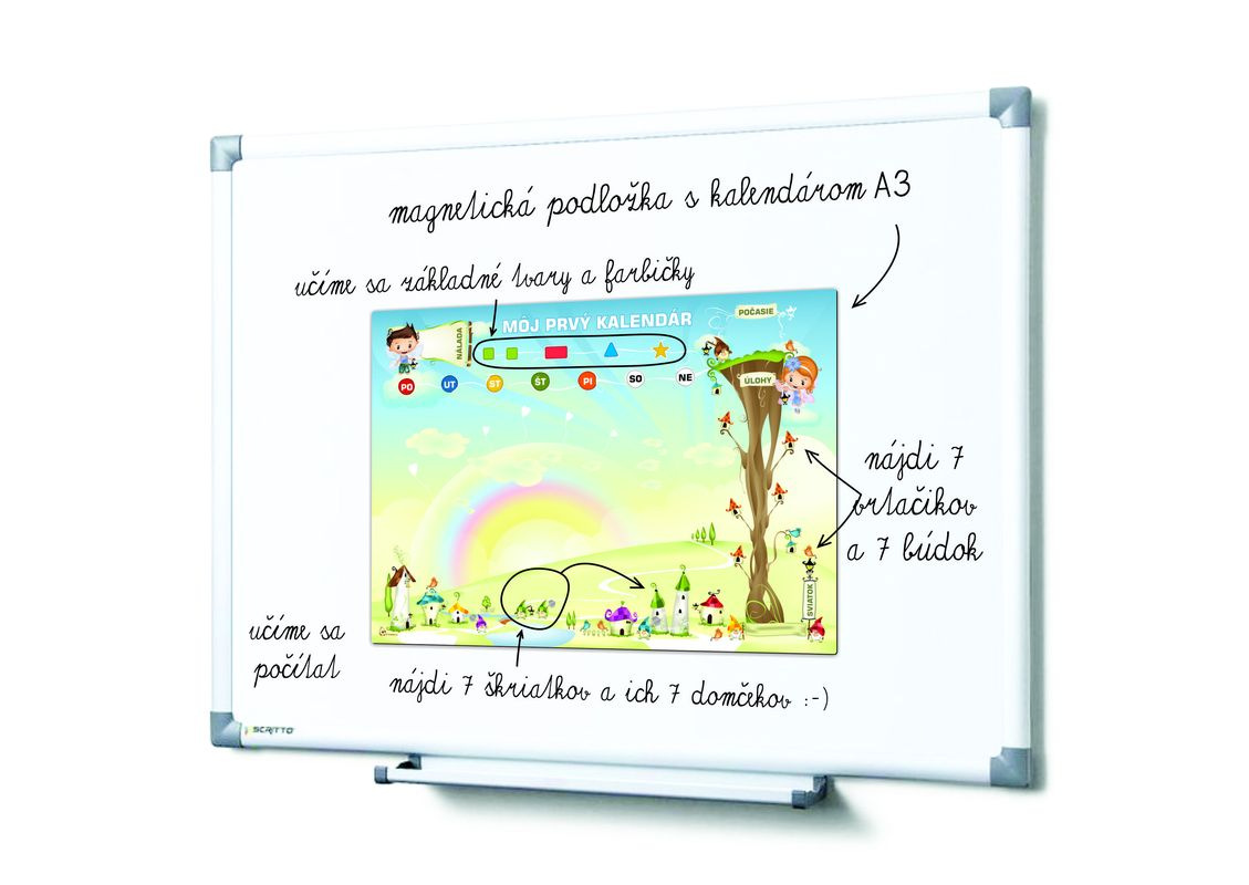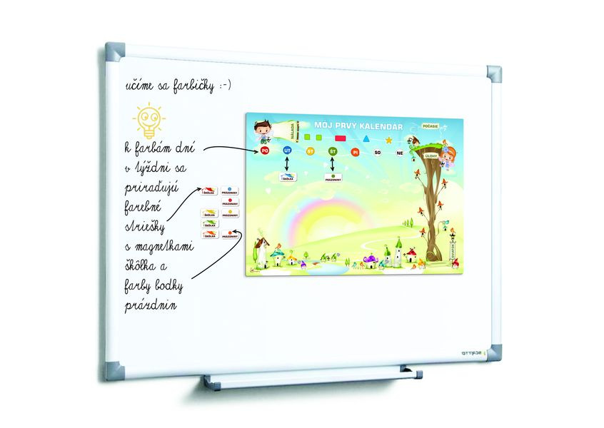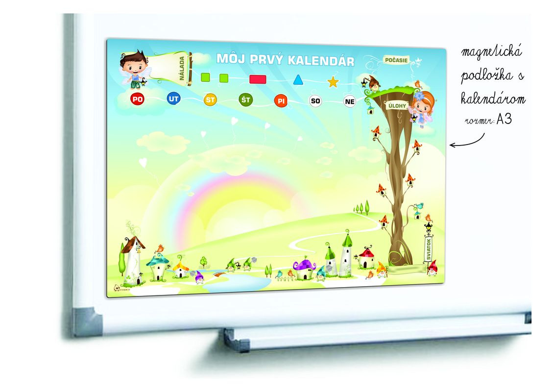 Ein origineller Magnetkalender für Kinder, die gerne mit Magneten spielen. Der Kalender verfügt über eine Magnetunterlage im Format 420 x 297 mm, die z.B. an einem Laptop oder Tablet „aufgeklebt“ wird. am Kühlschrank oder auf einem Blechteller und 114 Magnete, die die Kinder auf der Matte platzieren. Kinder lernen auf spielerische Weise: - ihre Lieblingsaktivitäten und -aufgaben planen - Farben und Grundformen kennenlernen - Jahreszeiten, Monate, Wochentage oder das Wetter bestimmen - ihre Stimmung einschätzen, zählen und vieles mehr. Liste der Magnete (114 Stück) – 12 Stück (Zahlen zum Bilden des Datums für den jeweiligen Tag) – Größe 20 x 20 mm – 12 Stück. Größe: Ringdurchmesser 25 mm - 1 Stück (Gestern x Morgen) - Größe: Ringdurchmesser 25 mm, 11 Stück (Feiertage) - Größe: 55 x 20 mm (weißer Magnet zum Beschriften des Namens) - 5 Stück (Kindergarten) - Größe: 40 x 20 mm (der farbige Baldachin ist der Farbe des jeweiligen Tages zugeordnet) - 5 Stück (Feiertage) - Größe: 40 x 20 mm (der farbige Baldachin ist der Farbe des jeweiligen Tages zugeordnet) - 3 Stück (Feiertage) - Größe: 40 x 20 mm - 5 Stück (Jahre: 2020 bis 2024) - Größe: 40 x 20 mm - 2 Stück (weiß - zum Bemalen eigener Aktivitäten) - Größe: 40 x 40 mm In einer Karte: 45 x 32 x 1 cm