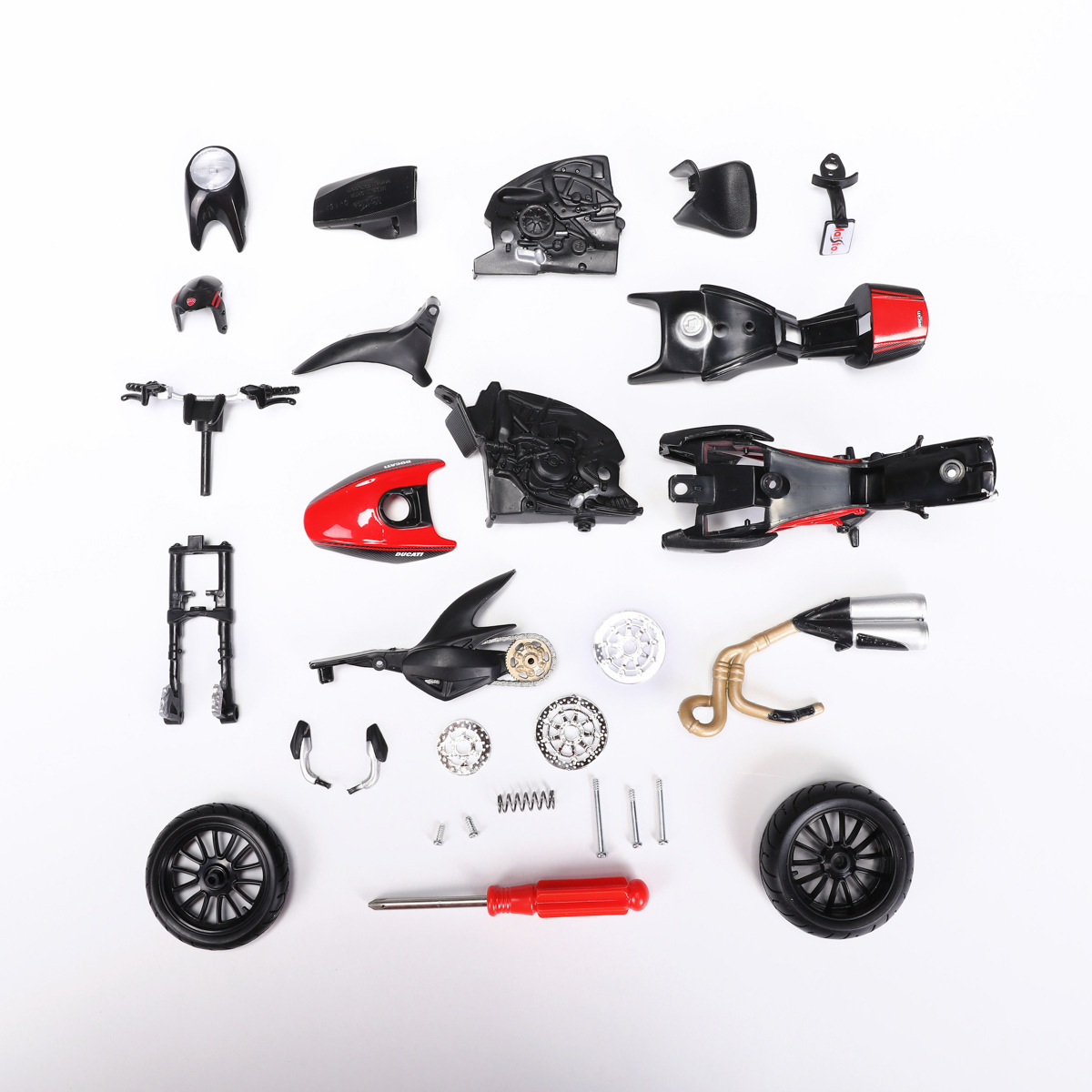 Ducati Diavel Carbon. Sestavte si svůj motocykl. Motocykl je vyroben z vysoce kvalitního tlakově litého kovu s plastovými díly. Je vybaven autentickými kabely a hadicemi, ovládacím pružinovým odpružením, pohyblivým podstavcem a bočním stojanem. Po dokončení je plně funkční podrobnou replikou. Na předlakované kovové tělo není potřeba žádné lepidlo ani barva. Včetně šroubováku a montážního nástroje. Rozměry balení: 18,5x25,5x5,5cm. Věk: 8+
