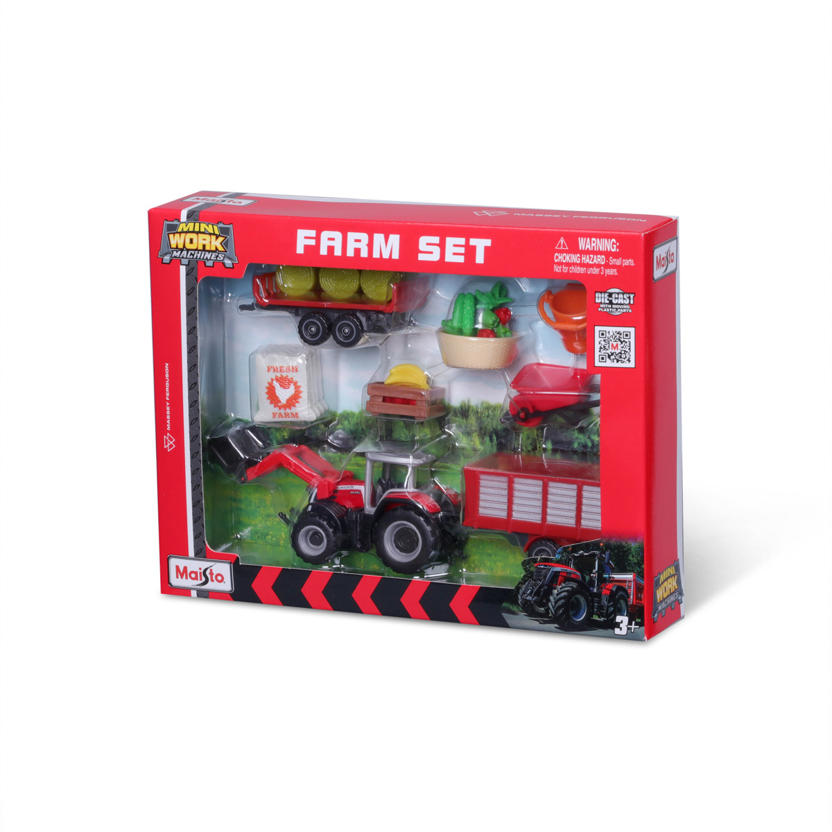 Mini Work Machines – Super farmářský set Massey Ferguson. Super set obsahuje: kovový model traktoru Massey Ferguson s plastovými detaily, přídavný traktor s buldozerem, dodávku, transportér, přívěs, strom, zeleninu a další příslušenství k sestavení vlastní farmy. Doplňky jsou vyrobeny z plastu. Součástí je také papírová hrací podložka o rozměru 29,7 x 21 cm. Model traktoru o velikosti 3'' (cca 7,5 cm) je vyroben z tlakově litého kovu. Rozměry balení: 23,2 x 20,49 x 4,45 cm. Věk: 3+