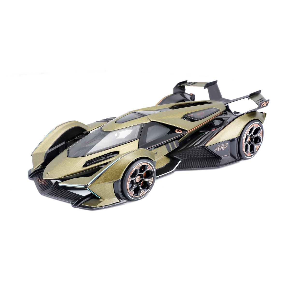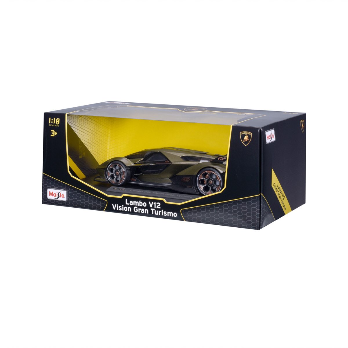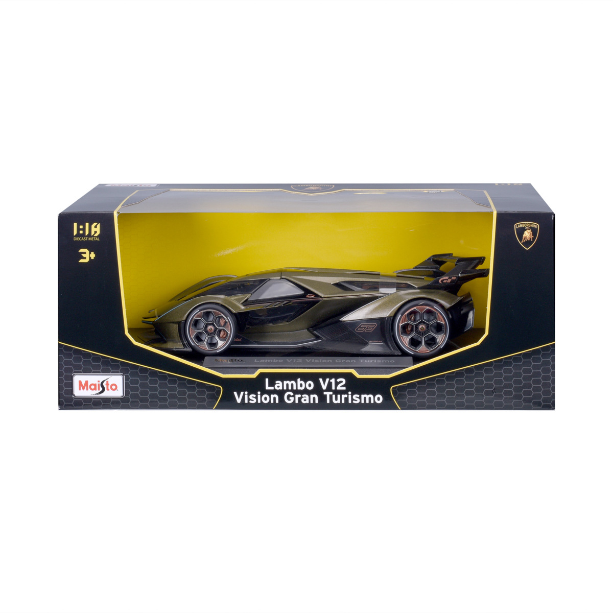 Lamborghini V12 Vision Gran Turismo. Zcela nový litý model auta v měřítku 1:18 modelu Lamborghini V12 Vision Gran Turismo. Skutečné gumové pneumatiky. Otočná kola. Má otevírací kapotu a dveře. Kovový model s plastovými díly. Detailně propracovaný interiér, exteriér, motorový prostor. Rozměry balení: 34,6x13,8x18,7cm. Věk: 3+