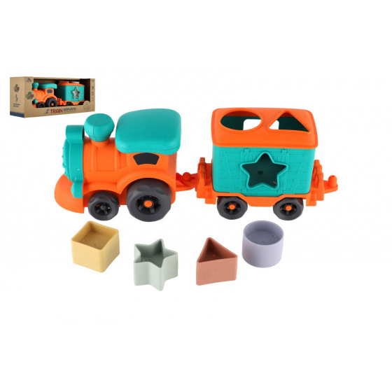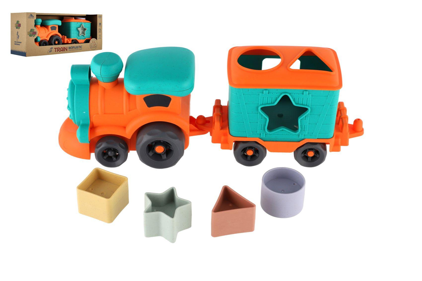 Beschreibung Teddies Mašinka/vláček s vagónem bioplast 30cm vkládačka na volný chod v krabičce 35x14x10cm 18m+