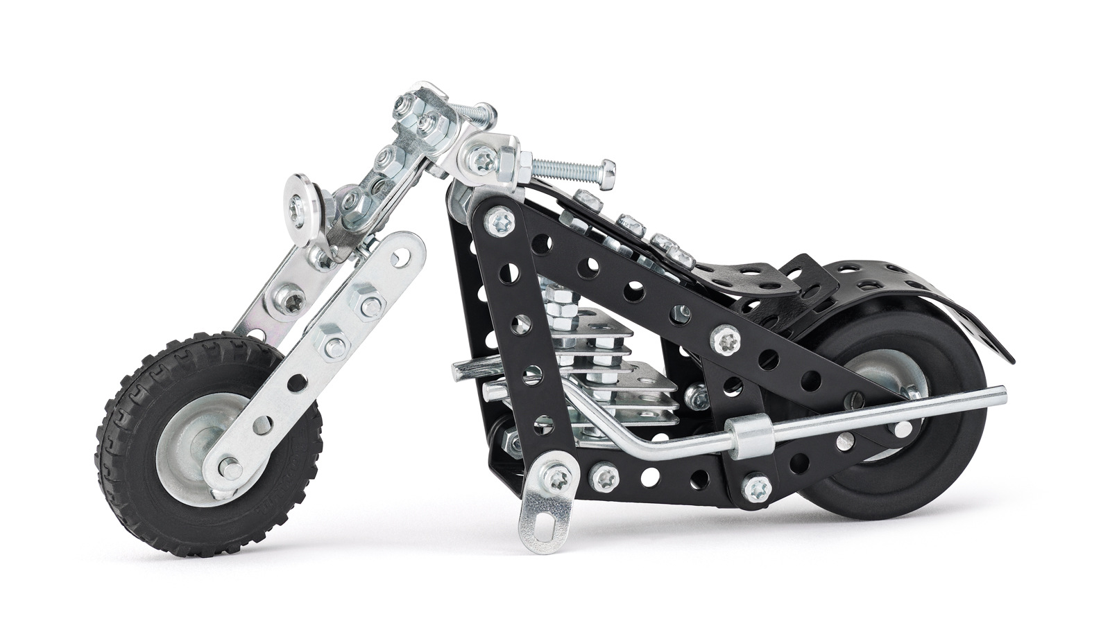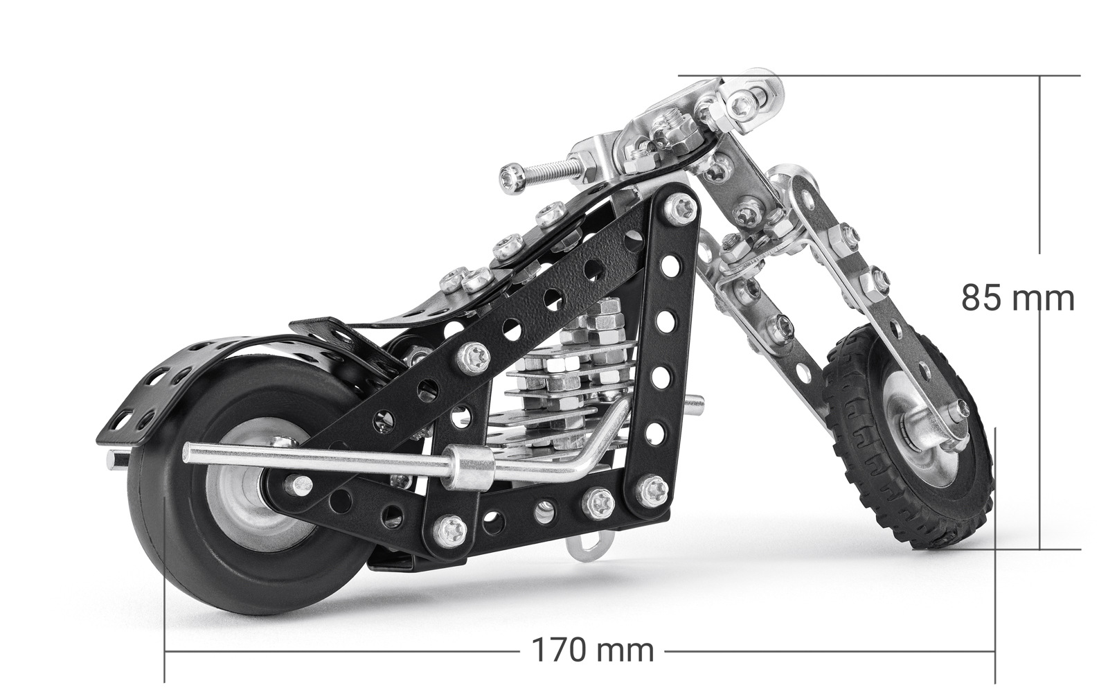 Klasická jednovrstvá stavebnice Merkur 11 – motocykly. Stavebnice obsahuje součástky potřebné pro stavbu modelů motocyklů. Součástí stavebnice je návodová knížka s návodem na stavbu 10 různých modelů. Tato jedinečná sada je ideálním nástrojem pro rozvoj technických dovedností a představivosti dětí. Stavebnice obsahuje kvalitní kovové díly, které se snadno spojují šroubky, což podporuje rozvoj jemné motoriky, logického myšlení a soustředění. Počet dílků: 230. Úroveň Merkur obtížnosti: 4. Barvy, velikost a vzhled výrobku se mohou lišit oproti uvedeným fotografiím. Baleno v krabičce. Rozměry balení: 18 x 26 x 5 cm. Nevhodné pro děti mladší 3 let. Věk: 5+