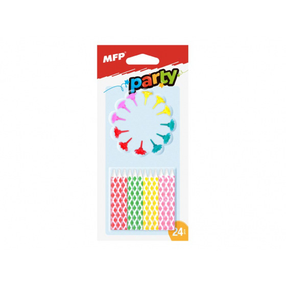 Sada barevných dortových svíček s držákem. Pořiďte oslavenci dortové svíčky, které dozdobí už tak dokonalý dort a splní oslavenci jeho tajné přání!BALENÍ OBSAHUJE:- 24 ks barevných svíček (zelená, červená, žlutá, růžová)- 12 ks barevných držákůVAROVÁNÍ:Slouží jako dekorace, není hračka, není určeno ke konzumaci! Při manipulaci s otevřeným ohněm dbejte zvýšené opatrnosti, nevystavujte průvanu. Svíčku postavte svisle na nehořlavý podklad. Nenechávejte hořet bez dohledu. Nutná stálá přítomnost dospělé osoby!Dodáváme v plastovém obalu se závěsem.Uvedená cena je za 1 balení.