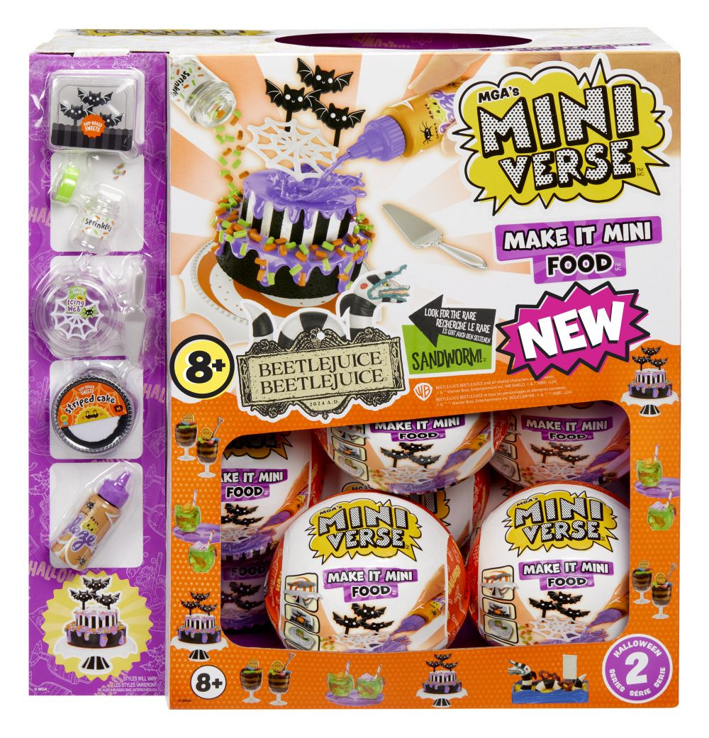 Mini hračky...VELKÁ překvapení! Udělej to! Naservíruj to! Rozbal strašidelné jídlo nebo nápoj ve formě mini replik. Je tak miniaturní, ale i přesto s neuvěřitelně realistickými detaily! Jídlo nebo nápoj připravíš z ingrediencí ve tvém balíčku, pak ho necháš alespoň 5 minut na přímém slunci vytvrdnout a můžeš servírovat! V této sérii můžeš vyrobit strašidelný dort, poháry špíny, hmyzí punče a Beetlejuice písečného červa.