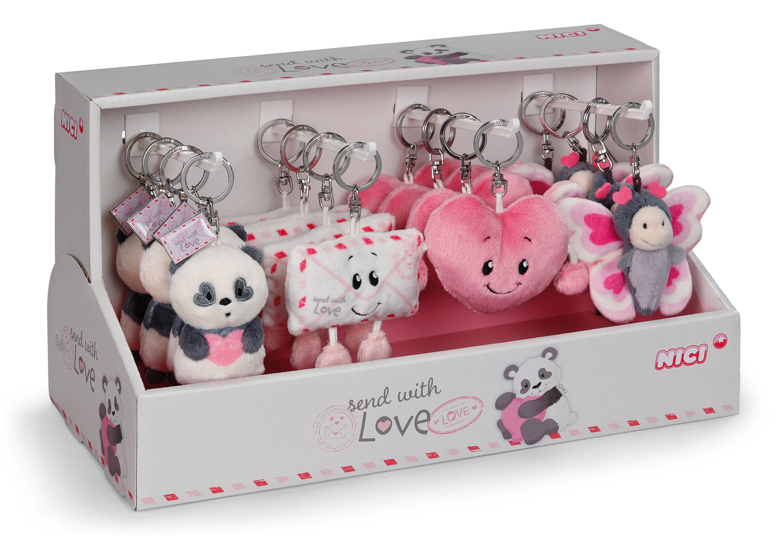 CDU NICI Pultový display – Love Classic – klíčenky, plný. Klíčenky o velikosti cca 8 cm, vyrobené z hebkého plyše NICI. Speciální edice klíčenek Love představuje rozkošné přívěšky v podobě zamilovaných motivů. Plyšovou klíčenku lze pomocí pevného kovového kroužku připevnit na klíče, batoh, školní tašku nebo peněženku. Klíčenka je součástí světa produktů NICI GREEN. Pro produkty NICI GREEN se používá téměř výhradně plyš a výplňový materiál vyrobený z recyklovaných materiálů. Pro tento účel se na RPET zpracovávají primárně recyklované PET lahve. Tento CDU obsahuje 16 ks/4 druhy. Assort je náhodný mix modelů. Výběr nelze ovlivnit. Varianty, které může assort obsahovat: panda Love, srdíčko Love, dopis Love, motýlek Love. Rozměry klíčenky cca: 6-8 cm. Rozměry CDU:. Věk: 3+