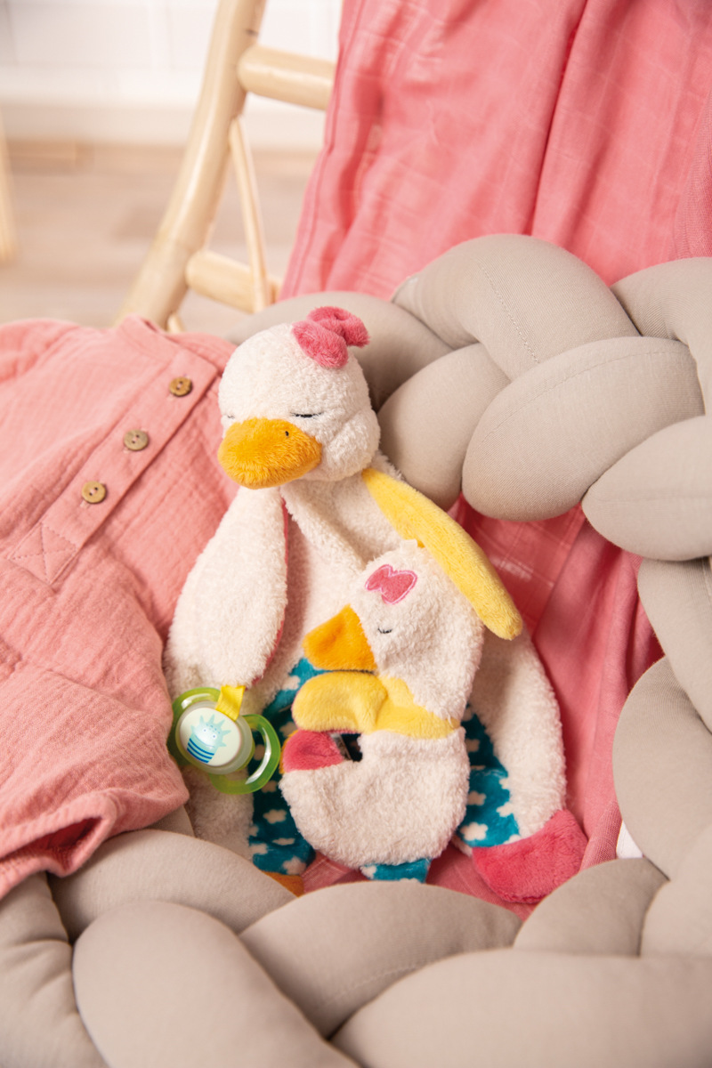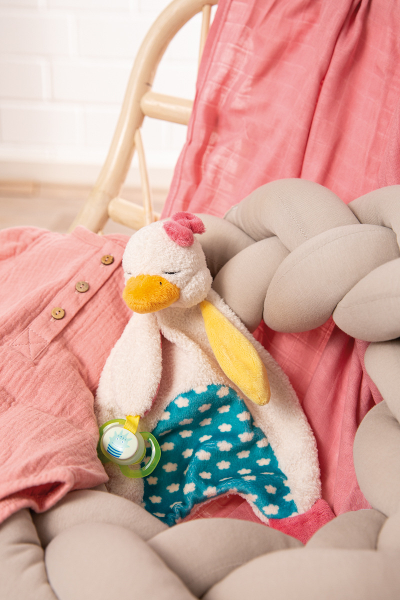 Muchláček je nepostradatelným společníkem pro každé miminko na hraní nebo mazlení. Muchláček Husička Gilli je vyrobena z velmi hebkého materiálu a má upevňovací kroužek na dudlík. Husička s růžovou mašlí na hlavě a rozkošnýma spícíma očima také zaujme svými oranžovými, tyrkysovými a růžovými barevnými akcenty. Doporučeno šetrné praní na 30°C. Rozměr: 26 x 25 x 8 cm. Rozměr balení: 30 x 12 x 8,5 cm. Věk: 0 m+