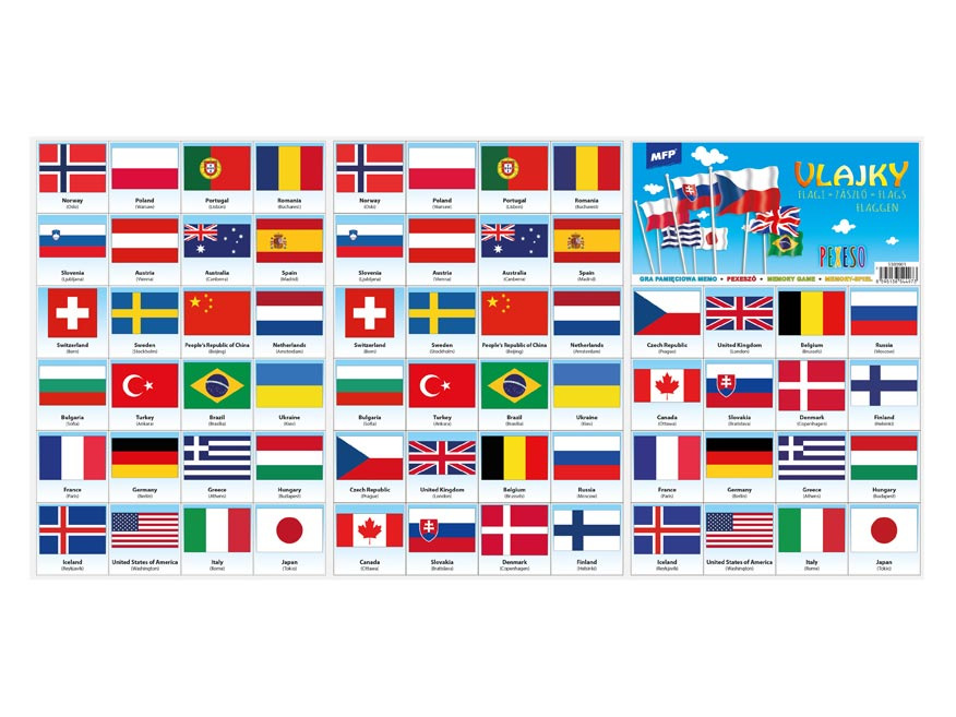 PEXESO je populární dětská stolní hra, která nikdy neomrzí a zapojit se můžou i dospělí. Pexeso - vlajky - je vhodné pro děti, které se chtějí naučit rozeznávat jednotlivé vlajky států a baví je zeměpis. Věděli jste, že slovo PEXESO vzniklo souslovím slov PEKELNĚ SE SOUSTŘEĎ? Výborná učební pomůcka pro děti a rodiče. Naučte své děti poznávat jednotlivé vlajky států a procvičujte jejich paměť. Tato hra je zabaví na dlouhé hodiny.Pexeso se skládá ze tří A4, na kterých najdete 64 kartiček vlajek různých států a návod ke hře - na každé kartičce je název státu a hlavní město.NÁVOD KE HŘE PEXESO:Pexeso mohou hrát nejméně dva hráči. Všechny rozstříhané kartičky zamíchají a rozloží obrázkem dolů do čtverce 8 x 8 kartiček. Nesmí se při tom dívat na obrázek. Hráči si určí pořadí hry. Hráč otočí dvě libovolné kartičky tak, aby si i ostatní spoluhráči mohli obrázky a jejich umístění zapamatovat. Pokud nemají kartičky stejné obrázky, otočí je a vrátí na původní místo. Pokračuje další hráč, který je na řadě. Jestliže objeví stejné obrázky, získává bod a obě kartičky vyřadí ze hry. Pokračuje do té chvíle, kdy otočí dva různé obrázky. Vyhrává hráč, který získá více bodů.PAPÍR: křída matná 350g + lamino lesk 1/1VELIKOST HRACÍCH KARET: 51x51cmVAROVÁNÍ:Nevhodné pro děti do 3 let. Nebezpečí vdechnutí a spolknutí malých částic.Uvedená cena je za 1 ks.