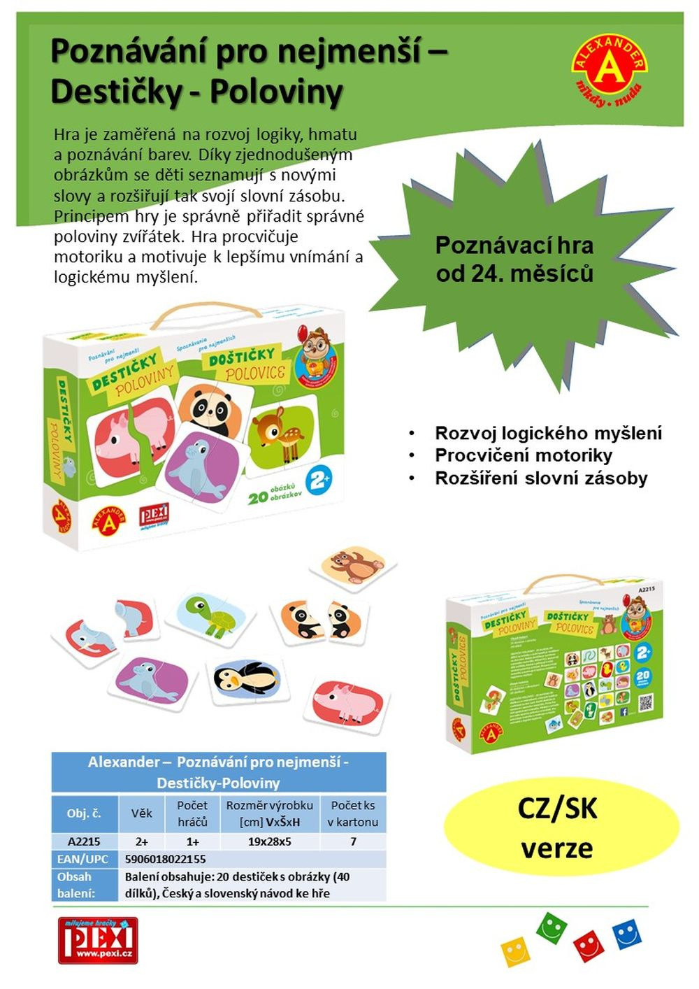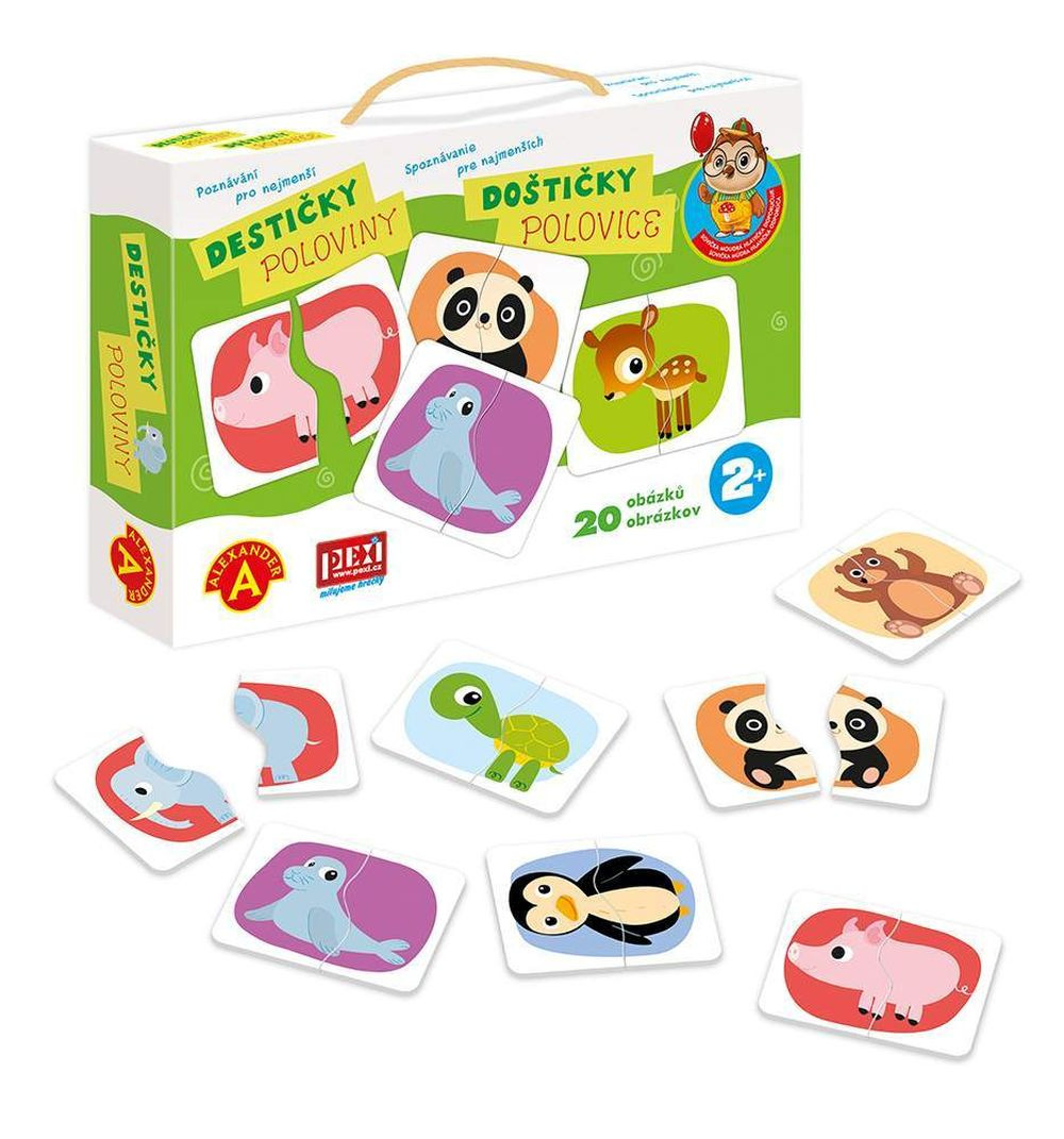Monate alt. Spiel aus der Serie "Eule, der schlaue Kopf".\n\nDas Spiel ist auf die Entwicklung von Logik, Tastsinn und Farberkennung ausgerichtet. Dank der vereinfachten Bilder lernen Kinder neue Wörter kennen und erweitern so ihren Wortschatz. Das Prinzip des Spiels besteht darin, die richtigen Hälften der Tiere korrekt zuzuordnen. \nDas Spiel übt die Motorik und motiviert zu besserer Wahrnehmung und logischem Denken.\n\nDie Garantin der Erkennungsspiele ist die anerkannte Psychologin der Universität Warschau, Alexandra Petrovská.\nDas Spiel ist geeignet für Kinder von 2 bis 3 Jahren.\n\nPackungsinhalt: 20 Platten mit Bildern aus festem Karton (40 Teile), Tschechische und slowakische Spielanleitung, stabile Box mit Griff für einfachen Transport
