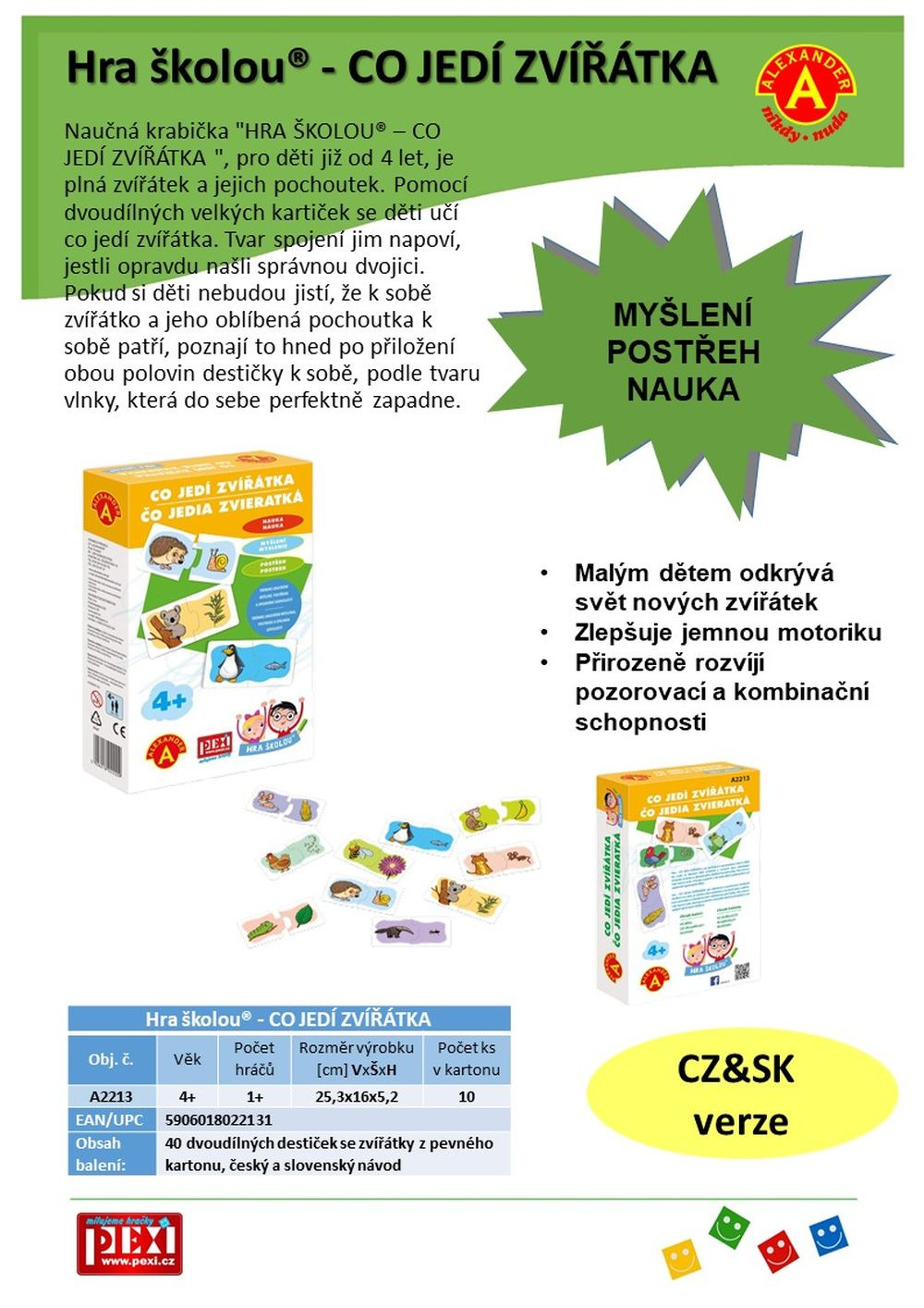 Lernspiele für kleine Entdecker. Die Box "HRA ŠKOLOU® – WAS ESSEN DIE TIERE", für Kinder ab 4 Jahren, ist voller Tiere und ihrer Leckereien. Was frisst ein Igel? Was nascht der Koala? Verbinde 20 Tiere mit ihrer Lieblingsleckerei und trainiere Aufmerksamkeit, Gedächtnis und Sehkraft. Ein Zeichentrick-Brettspiel für Kinder ab 4 Jahren. \n\nKennst du alle 20 Tierchen? Weißt du, was ihnen schmeckt? Erstelle 20 Paare aus Tier + Lieblingsleckerbissen und setze das Spiel nach deiner Fantasie fort. Wenn du zögerst, verbinde die Paare nach Farben.\nBeliebtes Spiel aus der Edition Spiel mit der Schule®.\n\nVORTEILE:\n- Viele Spielvarianten. Sobald Sie Paare gebildet haben, können Sie zum Beispiel nach Pflanzenfressern suchen oder weitere Leckereien hinzufügen, die den Tieren schmecken.\n- Zum Spielen jederzeit und überall. Nehmen Sie die Karten überall dorthin mit, wo sich das Kind langweilt. Einfach auspacken und plaudern.\n- Entwicklung von Beobachtungsgabe, Fantasie und Denken. Das Spiel fördert die Erkennungsfähigkeiten der Kinder sowie ihre scharfe Sicht. Paare können von Kindern ab etwa 4 Jahren selbstständig zusammengestellt werden.\n- Unterhaltung auch für Erwachsene. Warum frisst der Koala nur eine Art von Nahrung? Ist der Panda nur ein Pflanzenfresser? Zögern Sie? \nEntdecken Sie die Welt gemeinsam.\nSo viele Ideen, so viele Varianten\n\nWie das Kind wächst, wird es immer schwierigere Aufgaben bewältigen.\n1. Für die Kleinsten (ab 4 Jahren): Lassen Sie das Kind eigenständig Paare zusammenstellen und die Bilder betrachten.\n2. Mittlere Schwierigkeit: Geben Sie dem Kind konkrete Aufgaben, zum Beispiel finde alle Tiere, die Fleisch mögen.\n3. Schwierigere Fragen für kluge Köpfe: Fragen Sie und finden Sie gemeinsam heraus, zum Beispiel:\n• Wie viele Tiere von den Bildern leben im Meer?\n• Welche Tiere leben in der Tschechischen Republik?\n• Was jagt die Katze/der Storch/der Frosch noch?.\n• Welche Tiere fressen nur eine Art von Nahrung?\n\n\nSpieldauer\nDas hängt von Ihnen ab. Es braucht nur ein paar Minuten Zeit und eine feste Unterlage. Kinder lieben Tiere und stellen neugierige Fragen. Halten Sie eine Enzyklopädie oder ein Mobiltelefon mit Internet bereit.\nSicherheit an erster Stelle\nDas Paar Karten mit einer Größe von ca. 10 × 5 cm besteht aus einem robusten Material, das gegen Zerbeißen oder Herunterfallen aus großer Höhe beständig ist. Reinigen Sie sie mit einem feuchten Tuch ohne Spülmittel und andere Chemikalien.\n\n\nPackungsinhalt: 20 stabile Karten, die in Hälften mit gezeichneten Motivpaaren unterteilt sind: Esel + Heu, Löwe + Fleisch, Eichhörnchen + Nuss, Ameisenbär + Ameise, Koala + Eukalyptusblätter, Panda + Bambusblatt, Affe + Banane, Frosch + Fliege, Biene + Blume, Igel + Schnecke, Kuh + Gras, Maus + Mais, Storch + Heuschrecke, Pinguin + Fisch, Tausendfüßler + grüner Strauch, Hase/Kaninchen + Karotte, Hund + Knochen, Huhn + Korn, Vogel + Wurm, Katze + Maus, dazu wiederverschließbarer Beutel + Schachtel mit Beispielen der gezeichneten Motive.\n\nDas Spiel ist geeignet für Kinder von 4 bis 6 Jahren.