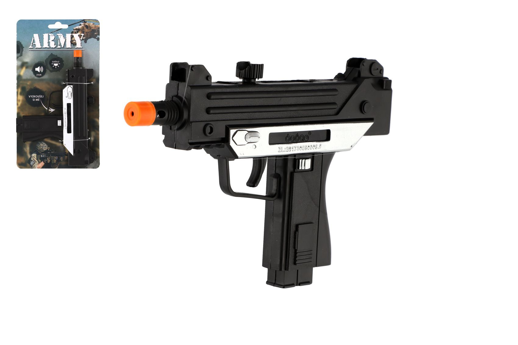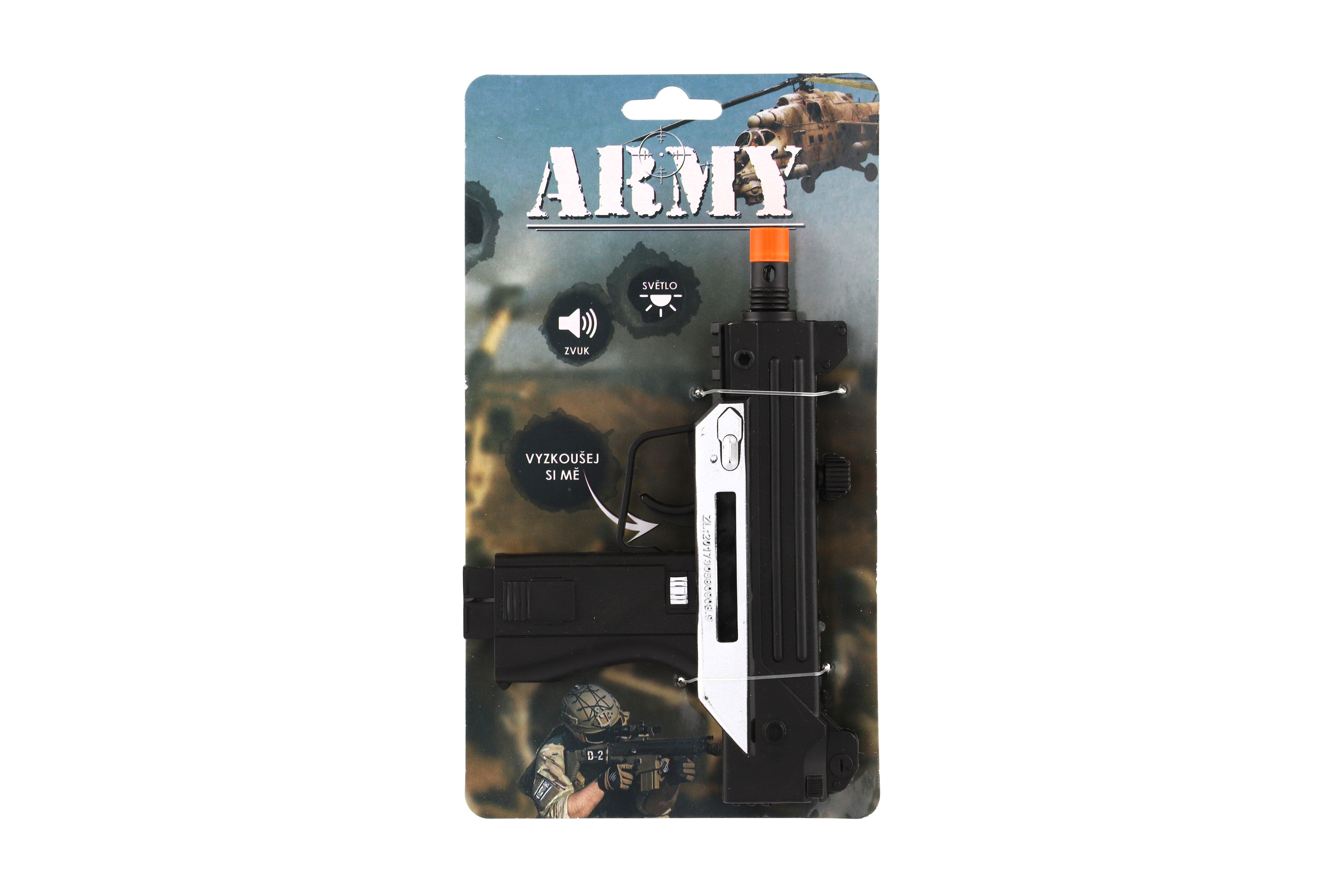 Beschreibung Teddies Pistole samopal plast ARMY 17,5cm na baterie se zvukem se světlem černá na kartě