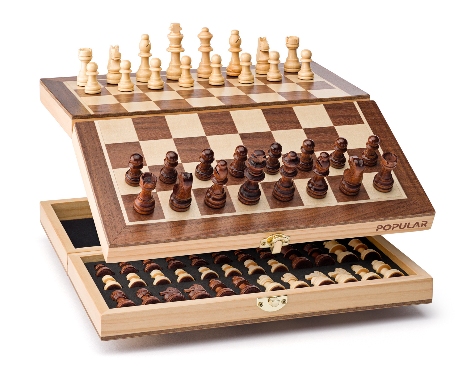 Luxusní provedení šachů v praktickém dřevěném boxu. Šachovnice je zpracována jako intarzie dvou barev dřeva. Figurky se po skončení hry umístí dovnitř. Součástí hry je návod. | Rozměr: 38 x 20 x 5,5 cm