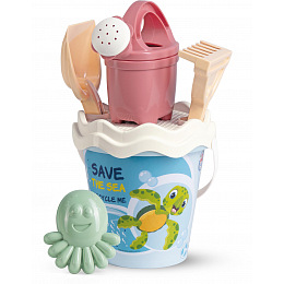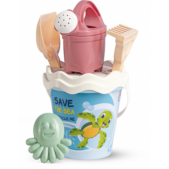 6dílná sada na písek, vyrobená z kvalitních recyklovaných plastů v pastelových barvách v Itálii. Obsahuje: Kyblík, konvičku 0,5 l, sítko, lopatku, hrabičky a tvořítko ve tvaru chobotnice. Kyblík: průměr 17 cm, výška 16 cm. Sada: výška 32 cm, váha 0,314 kg. Doporučený věk od 10 měsíců.