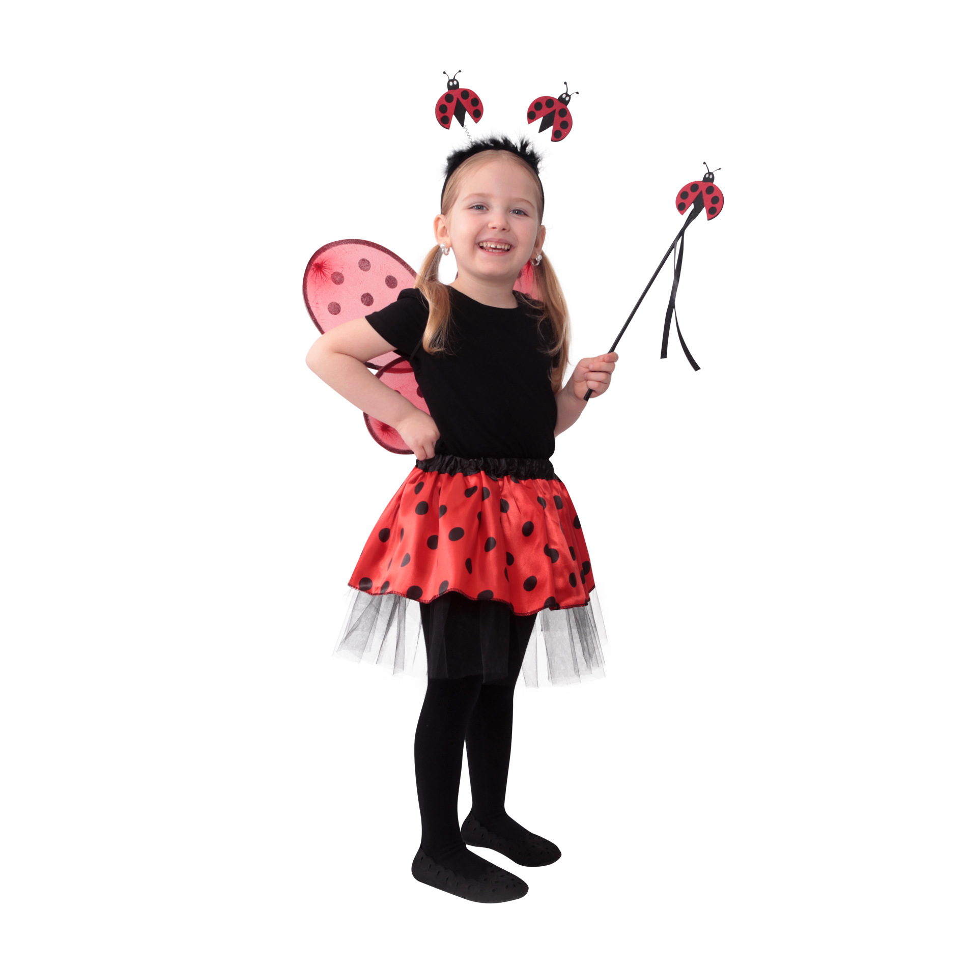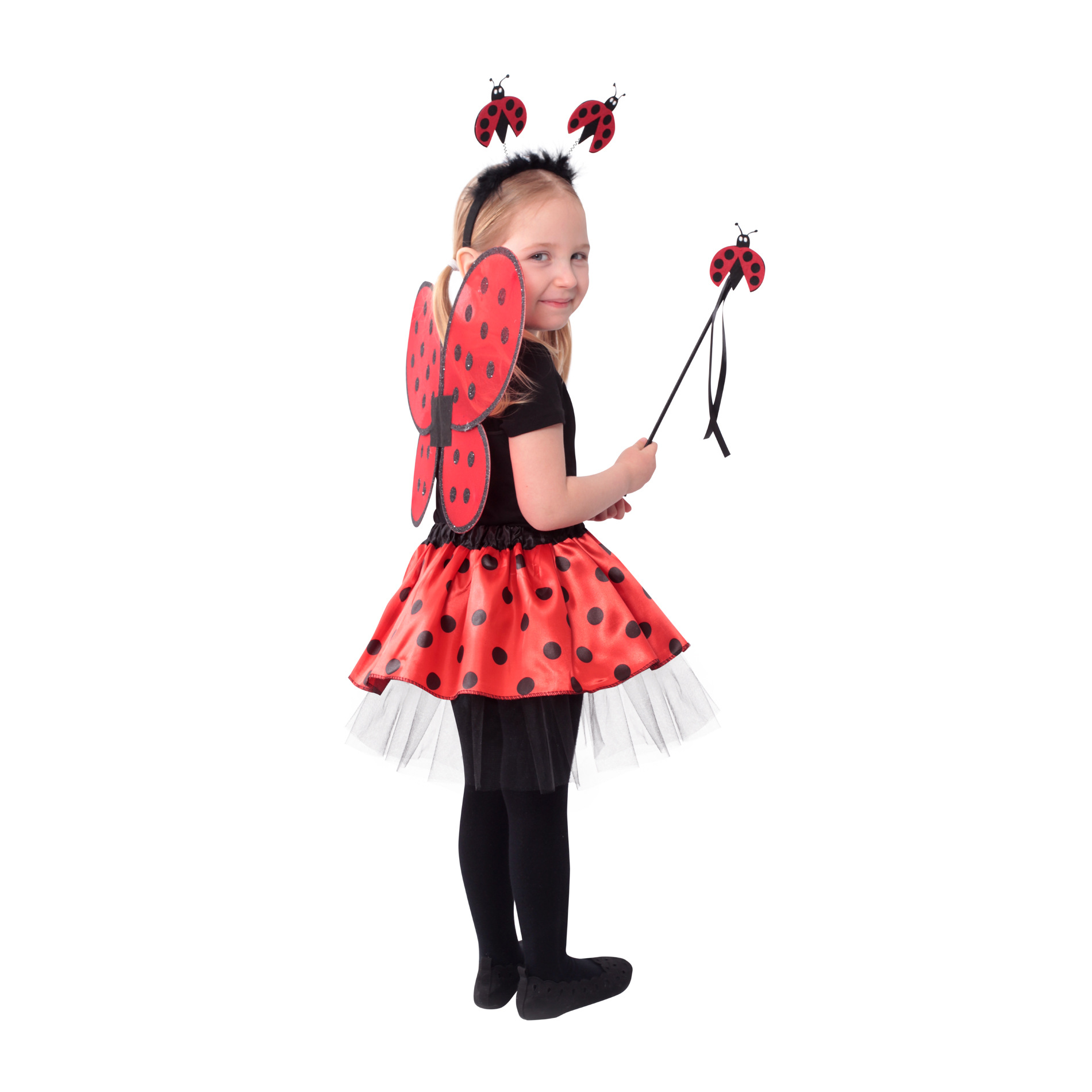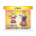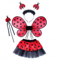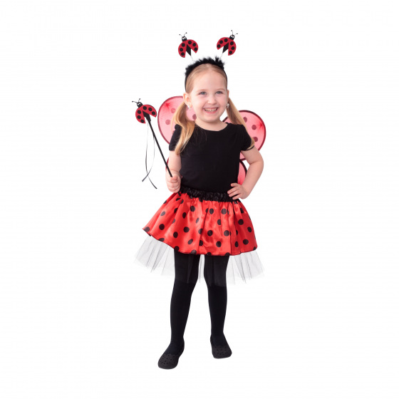 Roztomilý karnevalový kostým s motivem berušky je určen pro holčičky ve věkovém rozmezí 3-10 let. Tento kostýmek má červenou sukničku s puntíky, která je doplněna černou tylovou spodničkou. Dále obsahuje čelenku s peřím a beruškami, křídla na gumičku a hůlku. Celková délka sukýnky je cca 30 cm.