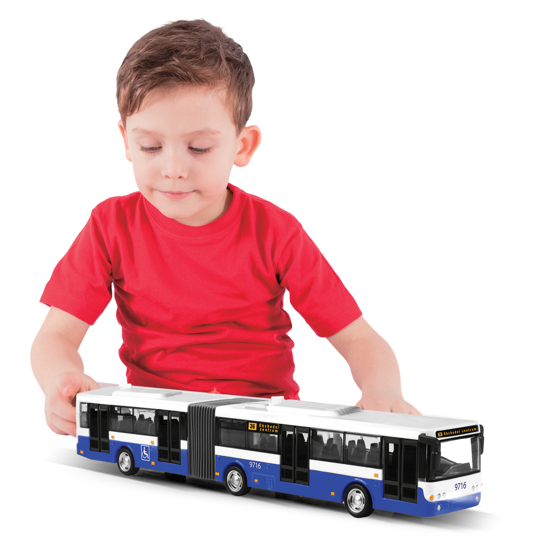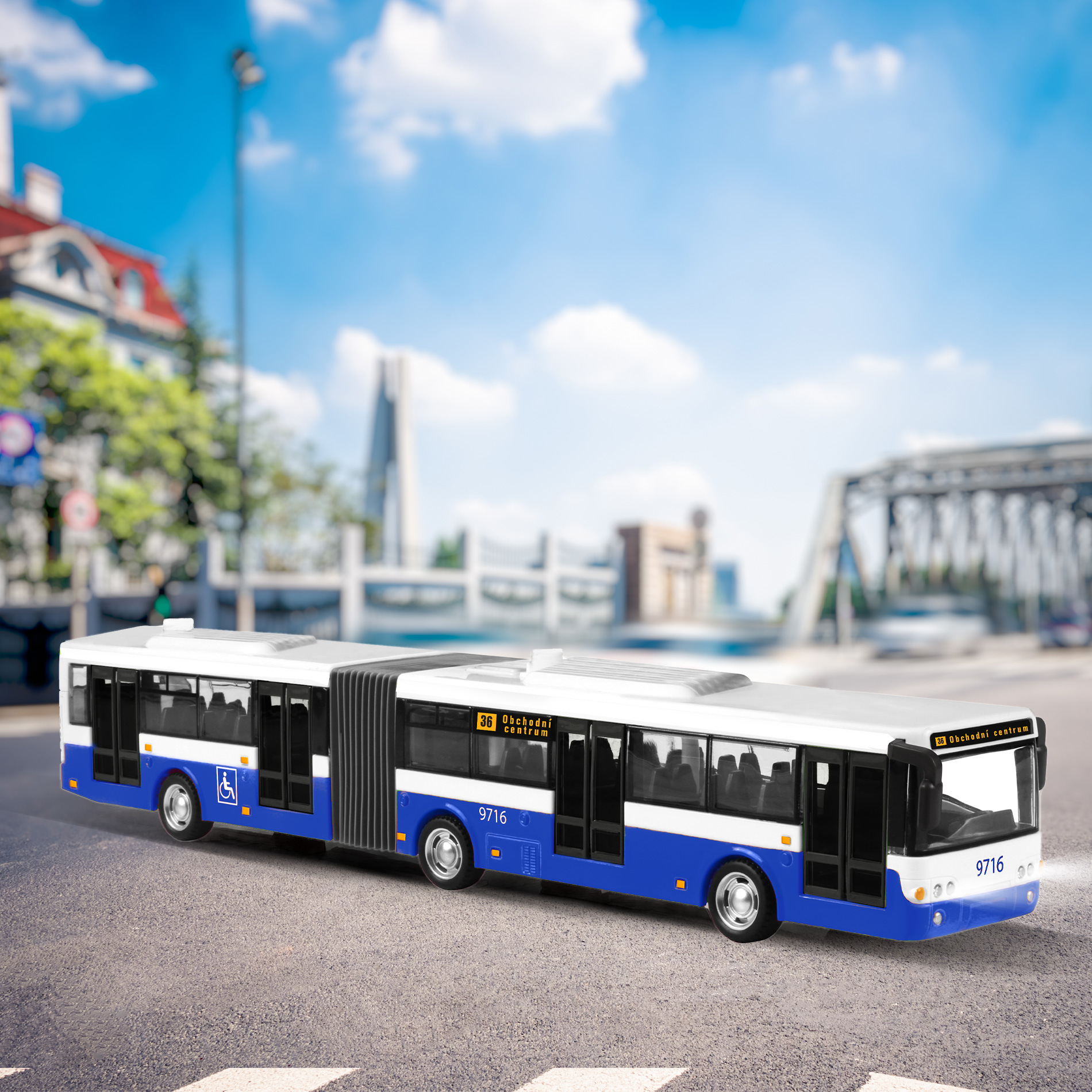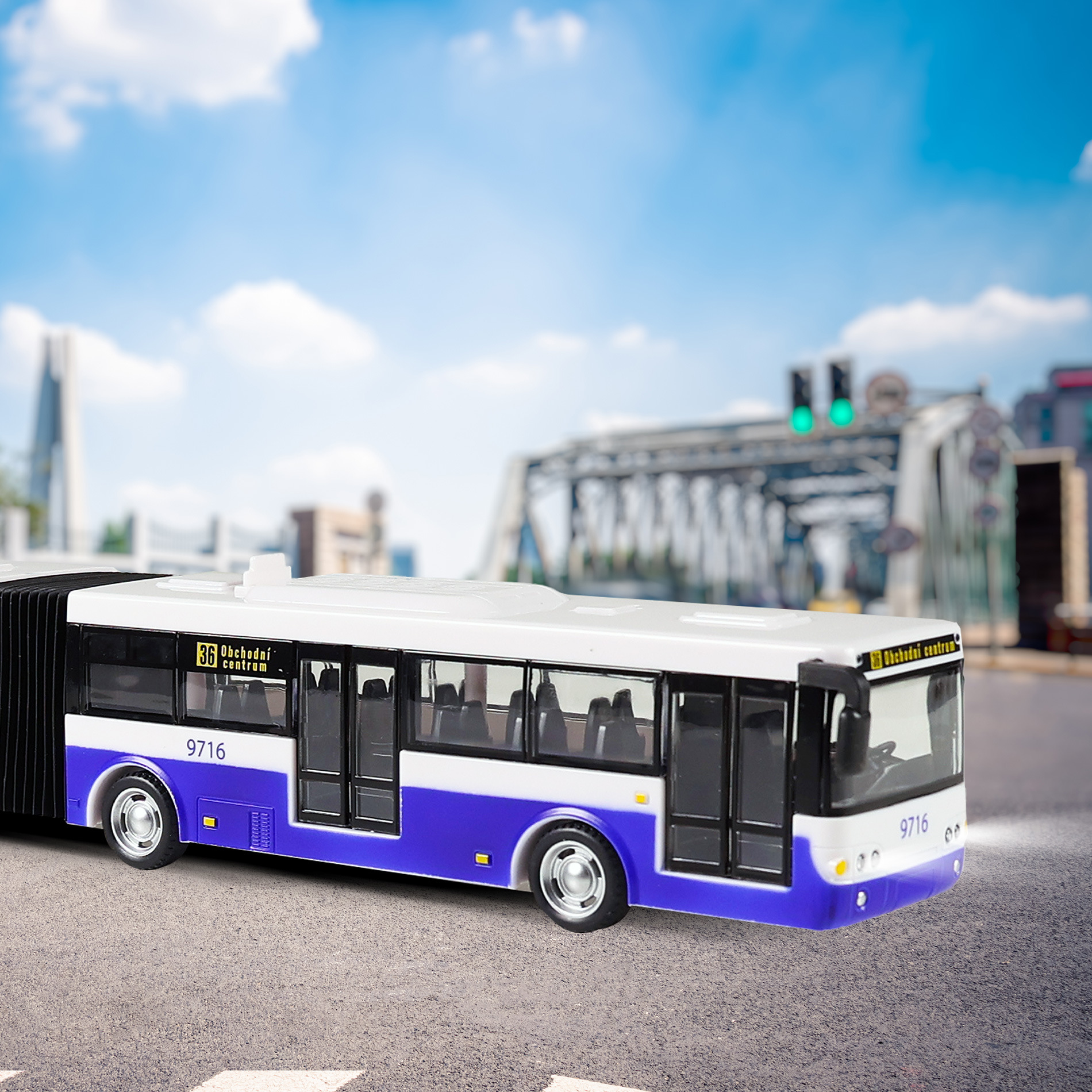 Originální autobus, který oznamuje zastávky v českém jazyce, je rozhodně ten pravý dárek pro vaši jízdu! Vaše děti si ho zamilují! Všechny dveře, lze manuálně otevřít a zavírají se pomocí posuvníků umístěných ve spodní části vozu. Při otevření předních dveří se ozve hlášení zastávky, při zavření zahlásí příští zastávku a navíc blikají přední světla. Po zatlačení na přední část střechy vydává autobus zvuk motoru. Je vyroben z plastu v měřítku 1:43, jeho délka je 36 cm a vyžaduje použití 3 ks baterií LR44/AG13, které jsou jeho součástí. Autobus jezdí na zpětný chod a hlásí celkem 7 zastávek česky. Tato unikátní hračka nadchne všechny kluky i holky!