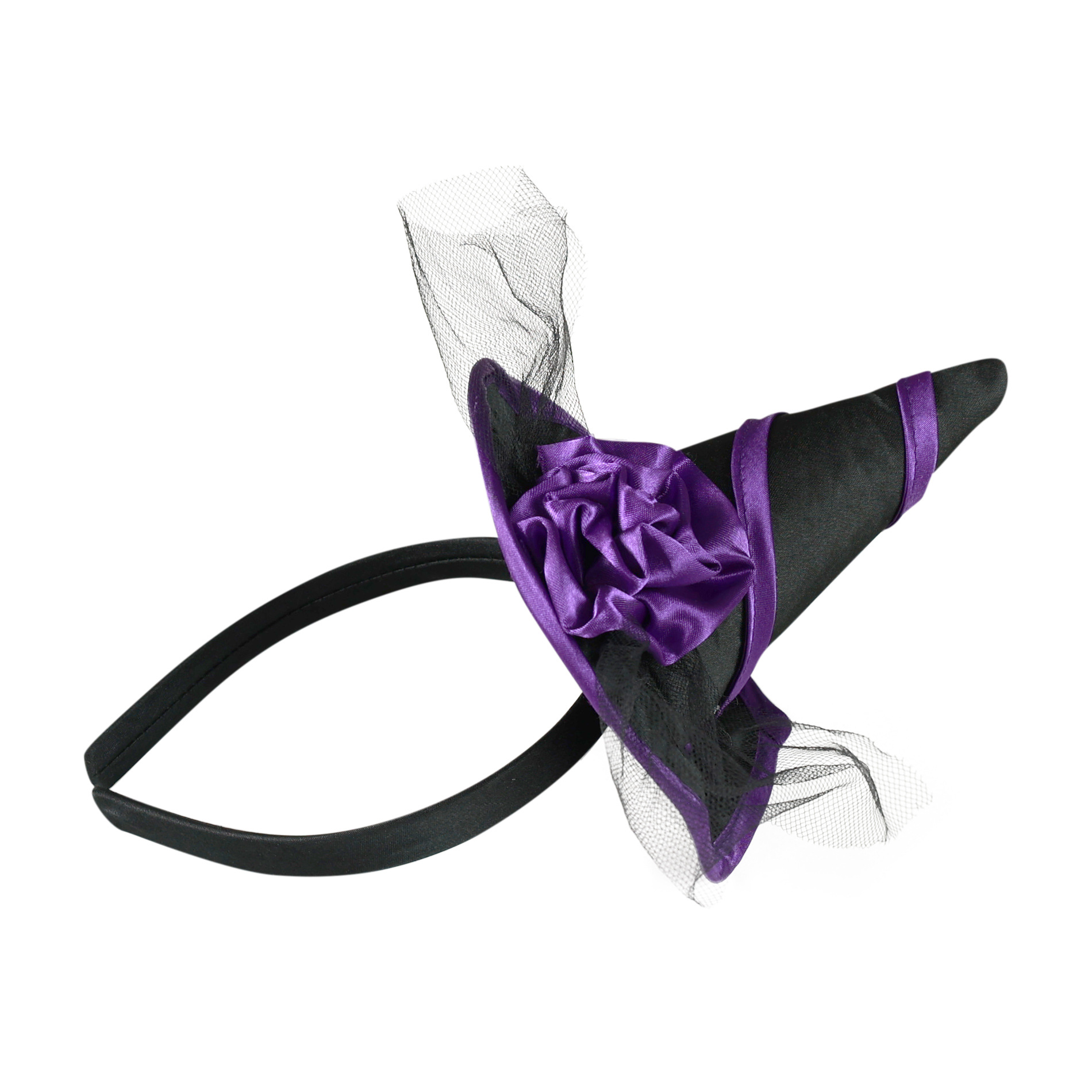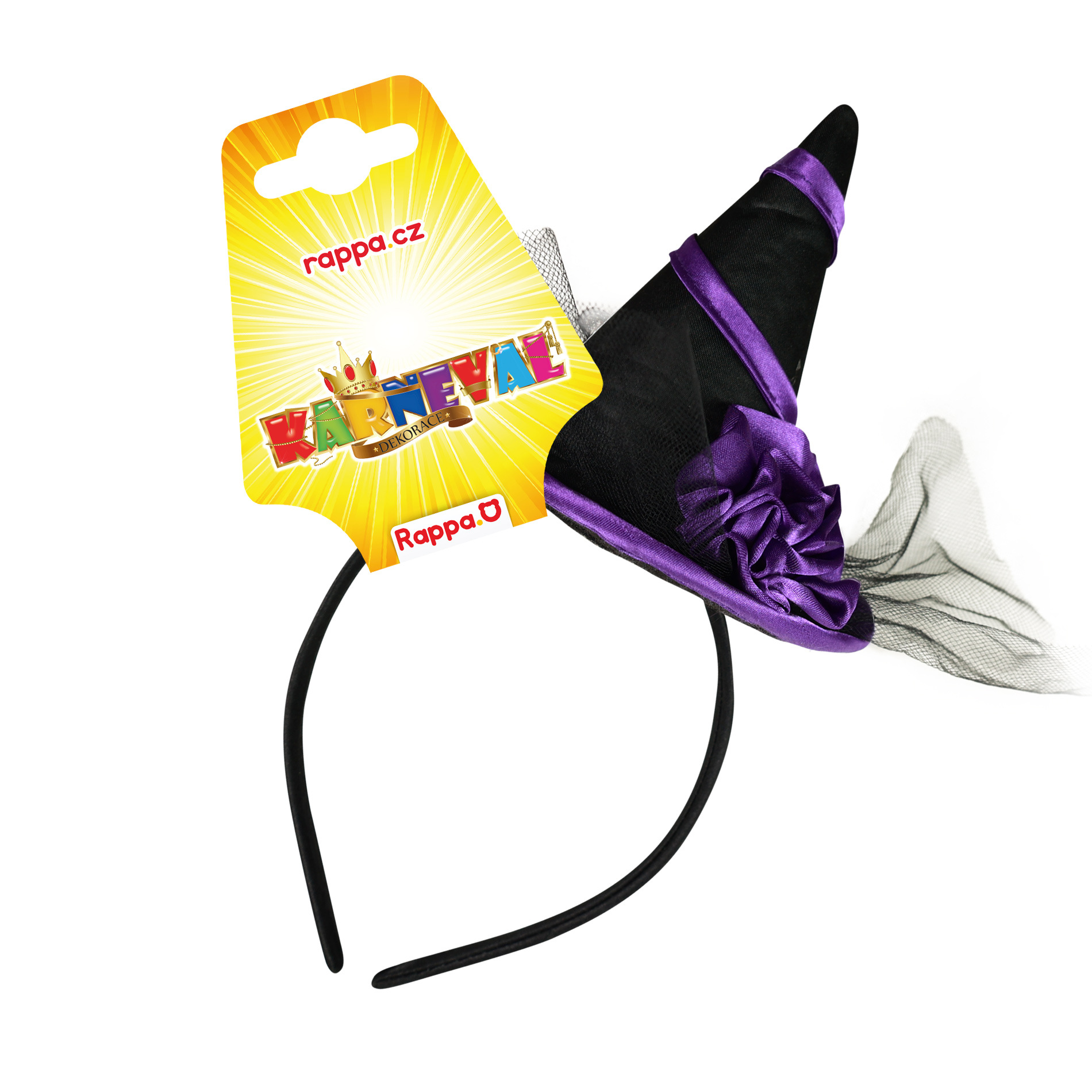 Stylová čelenka je perfektním doplňkem na večírek nebo Halloween párty! Černo-fialová čelenka je doplněna saténovým mini kloboučkem a tylovou ozdobou s květinou.