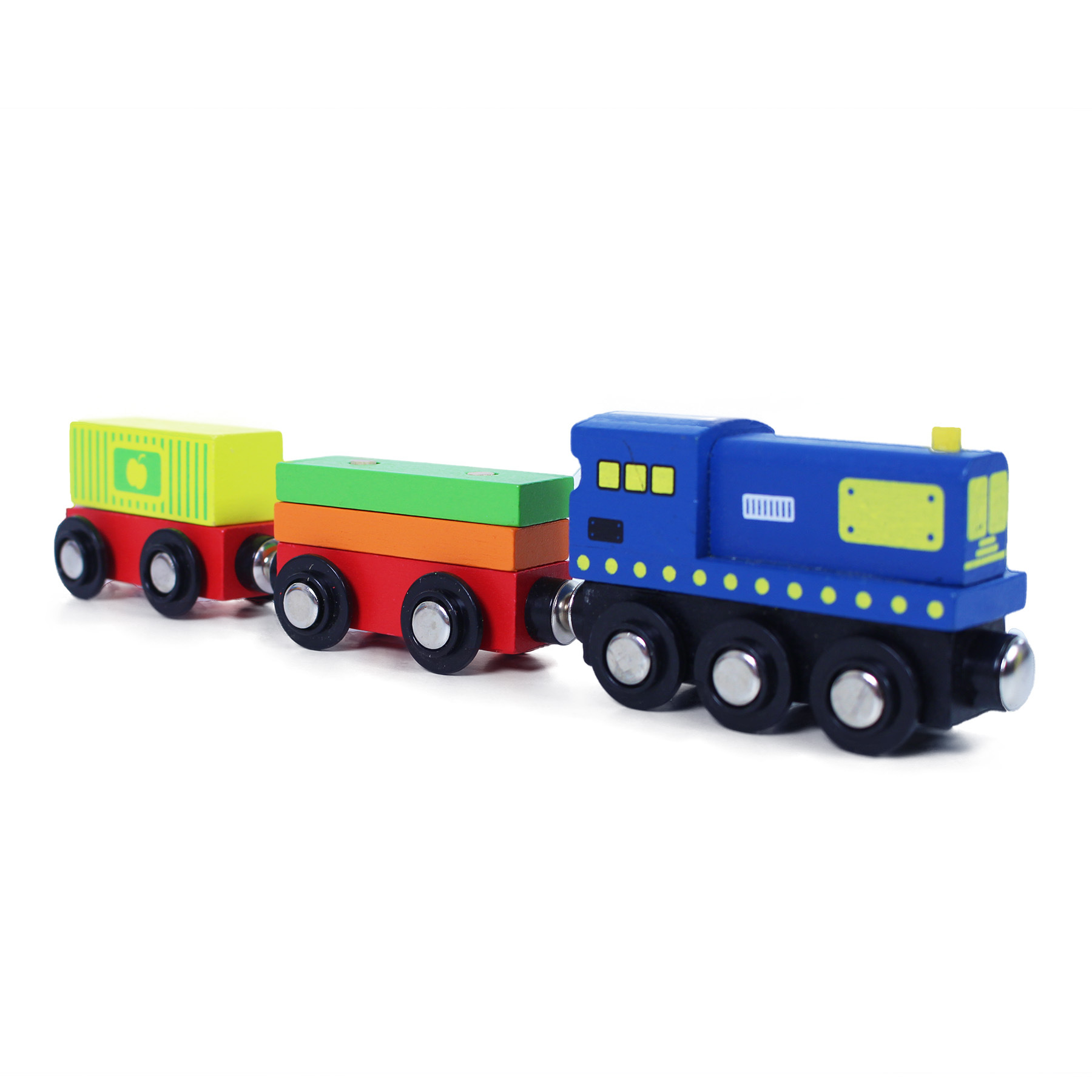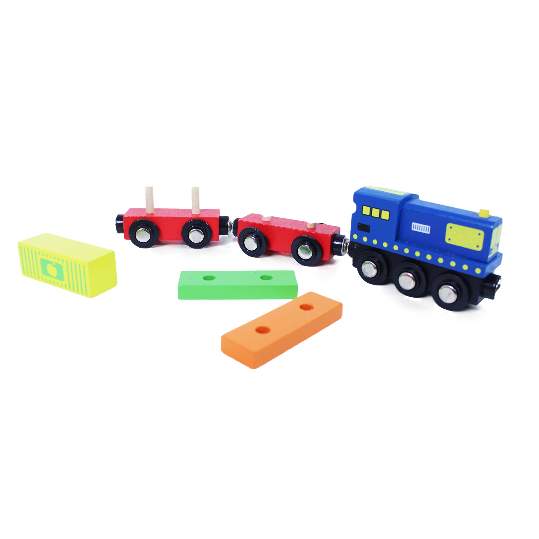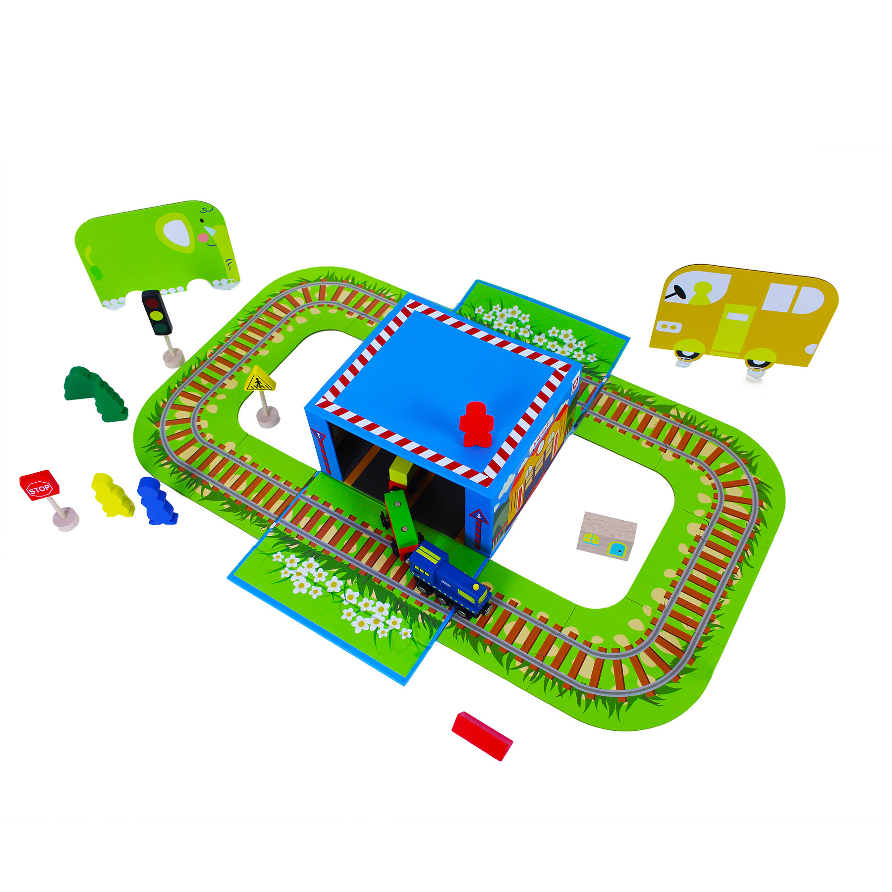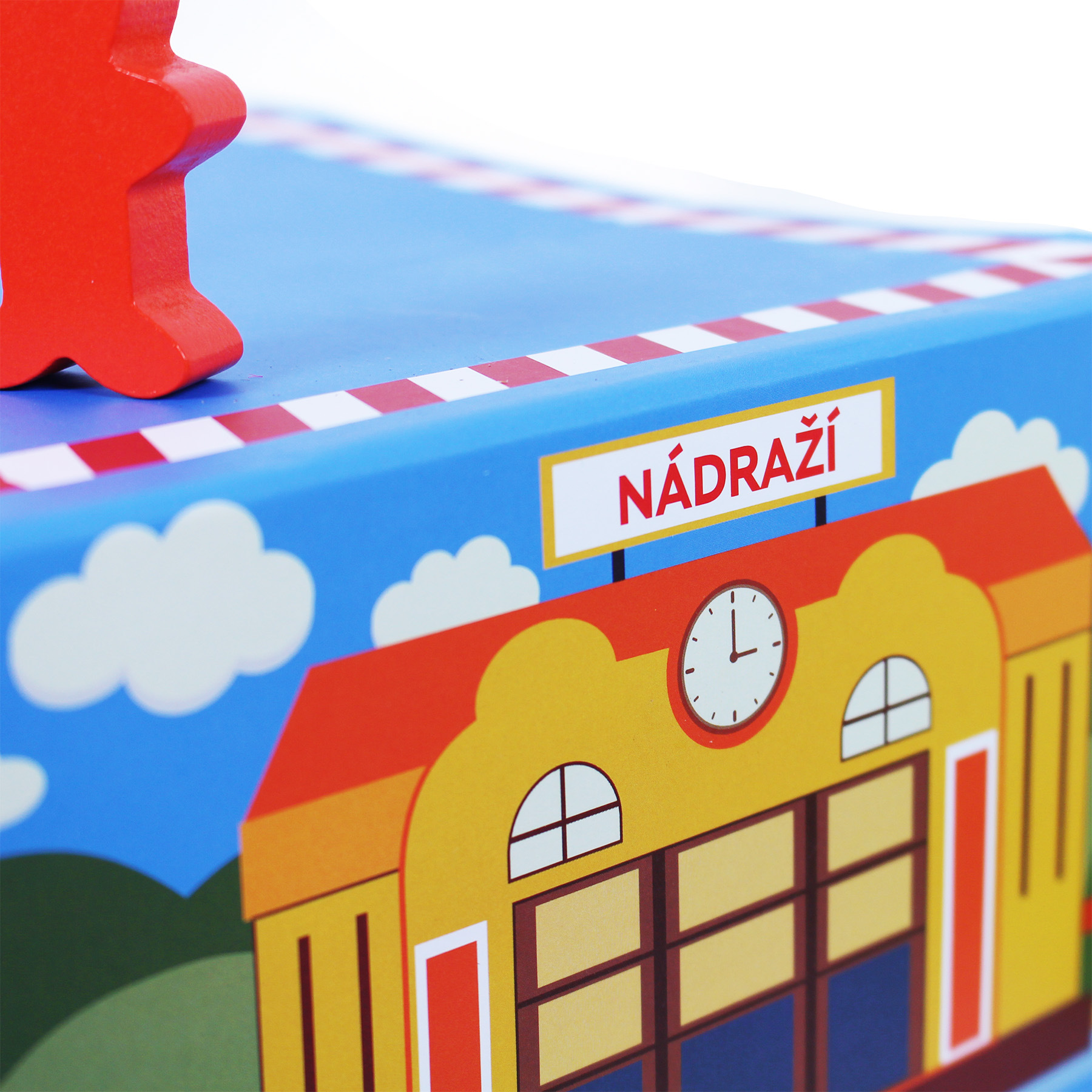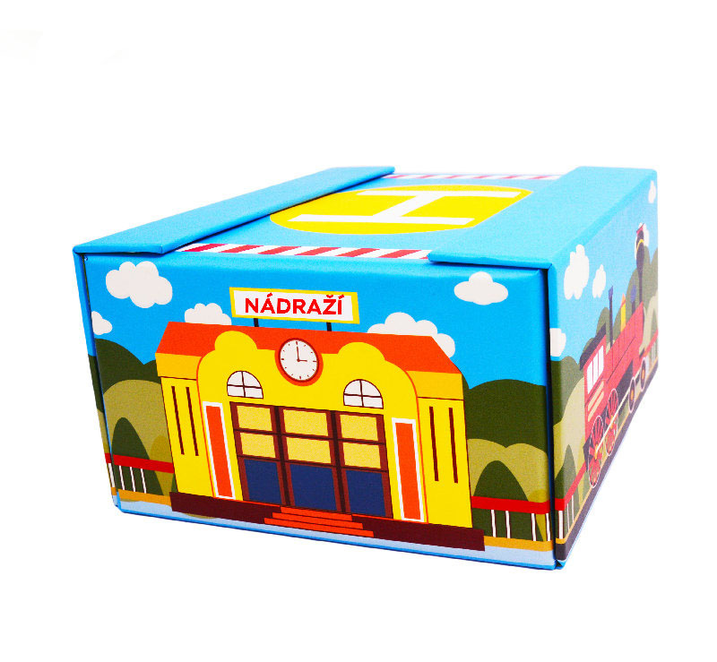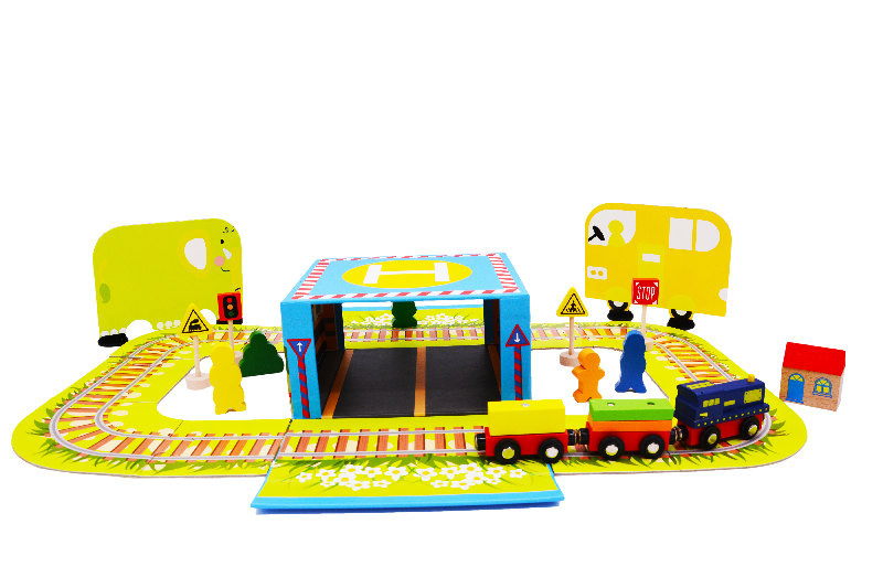 Bunter Holzzug mit Waggons, die durch Magnete miteinander verbunden sind. Das Paket enthält Holz- und Papierzubehör. Die Gleise sind mit Nummern und ihren englischen Bezeichnungen versehen, um die Zusammenstellung zu erleichtern und gleichzeitig eine Fremdsprache zu erlernen. Alles ist in einer Schachtel mit Magnetverschluss verpackt, die nach dem Auseinanderfalten als Bahnhof, Bahnsteig oder Depot dient.