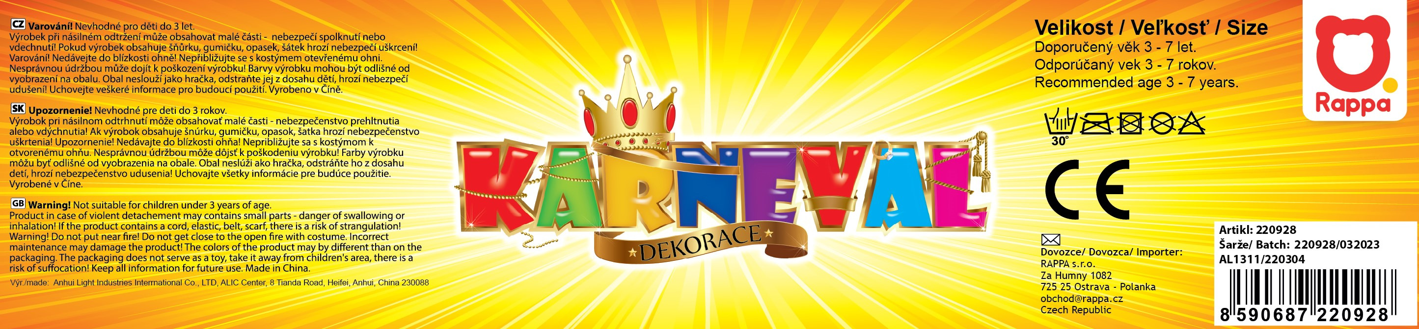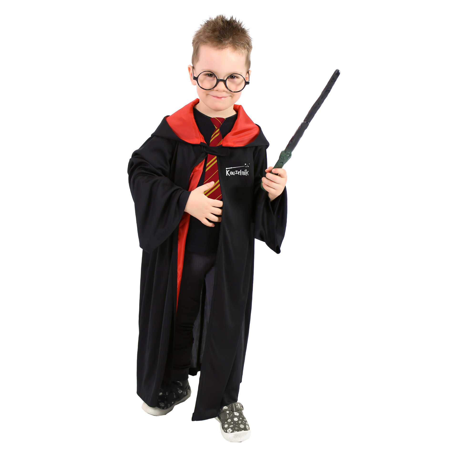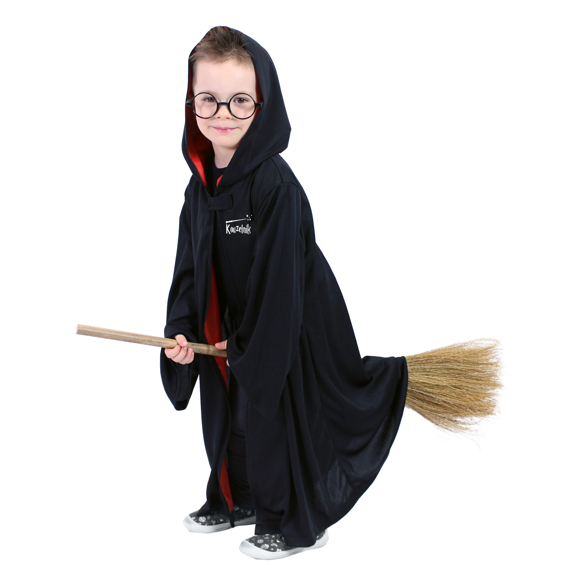 Der Kinder-Zauberumhang mit Kapuze ist für alle Mädchen und Jungen im Alter von 3-7 Jahren (104-136 cm) geeignet. Der schwarz-rote Umhang mit Halsverschluss ist auf der linken Seite mit der Aufschrift „Magician“ verziert. Zum Kostüm gehören eine Brille und eine Krawatte. Mantellänge ca. 75 cm.
