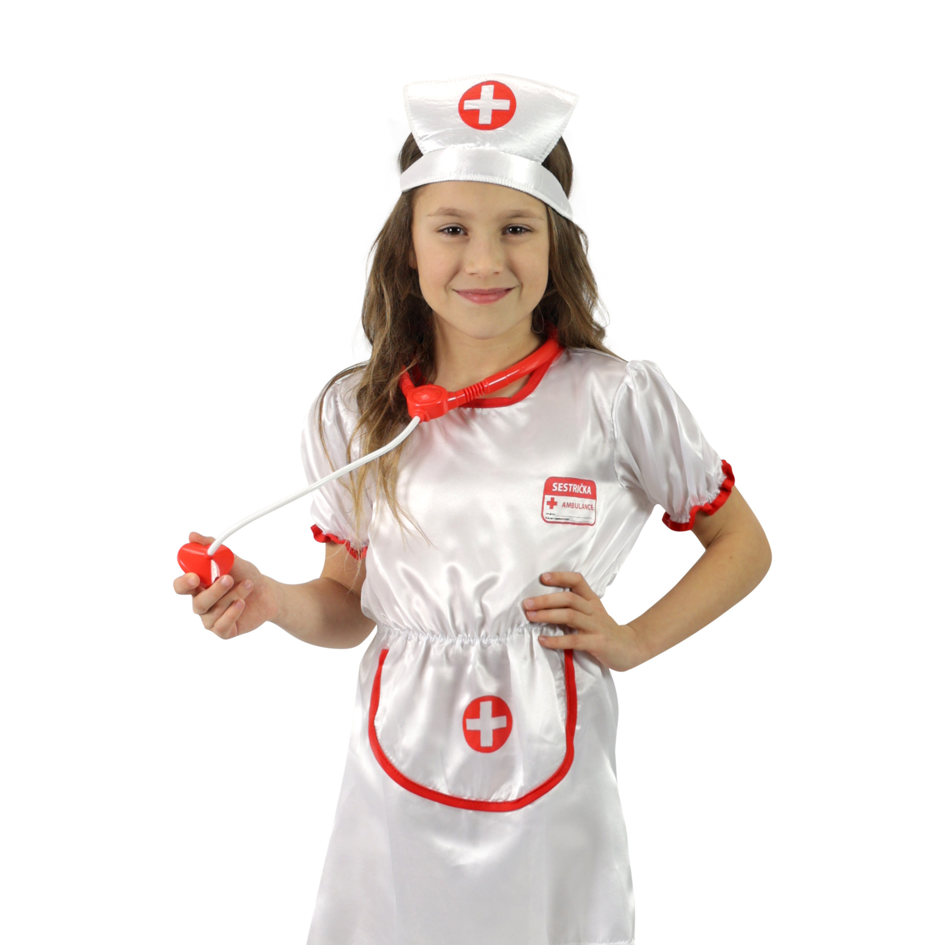 Ein schönes Karnevalskostüm für kleine Krankenschwestern. Das Kostüm in Größe S ist für Mädchen im Alter von 4-6 Jahren (105-116 cm) bestimmt. Das Set enthält ein Kleid und eine Mütze. Das Stethoskop ist nicht im Lieferumfang enthalten.