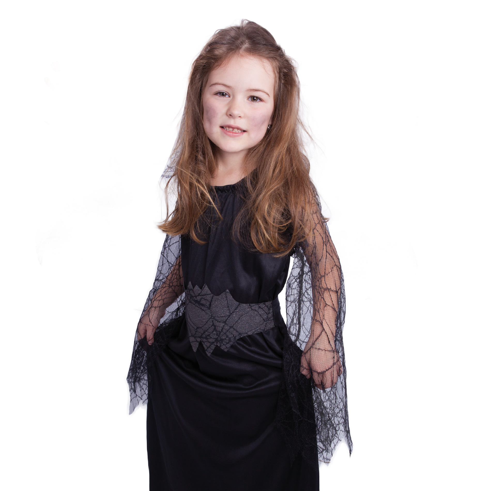 Kostým pro malé čarodějnice! Kostým černé barvy ve velikosti M je určen pro holčičky ve věkovém rozmezí 4-6 let (110-116 cm). Šaty jsou dekorovány průhlednými rukávy s motivem pavučin. S tímto úchvatným kostýmem se zaručeně staneš hvězdou karnevalu!