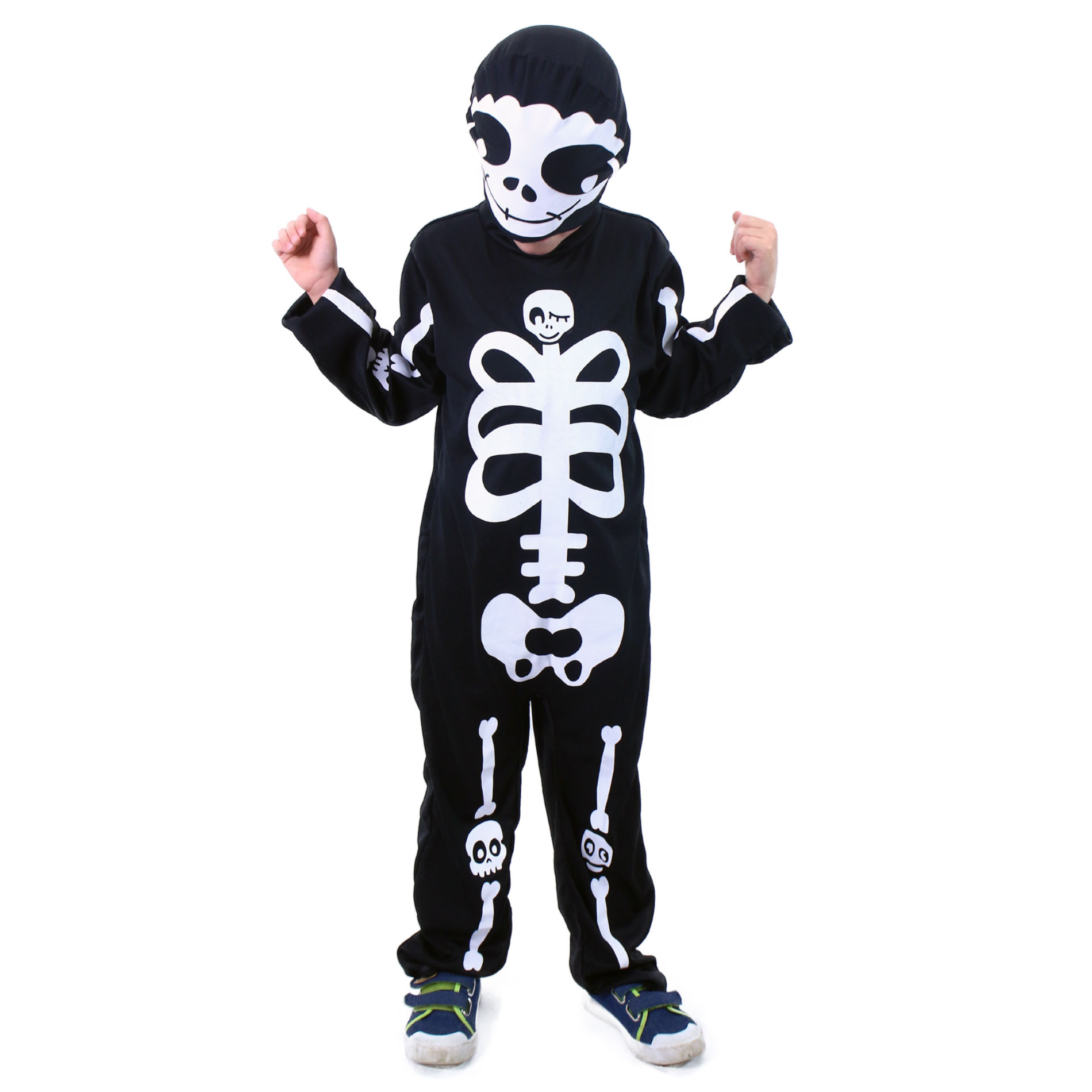 Gruseliges Karnevalskostüm mit Skelettmotiv! Das Kostüm in Größe M ist für Kinder im Alter von 6-8 Jahren (117-128 cm) geeignet. Die Verpackung enthält einen schwarzen Overall und eine Maske mit weißem Skelettdruck.