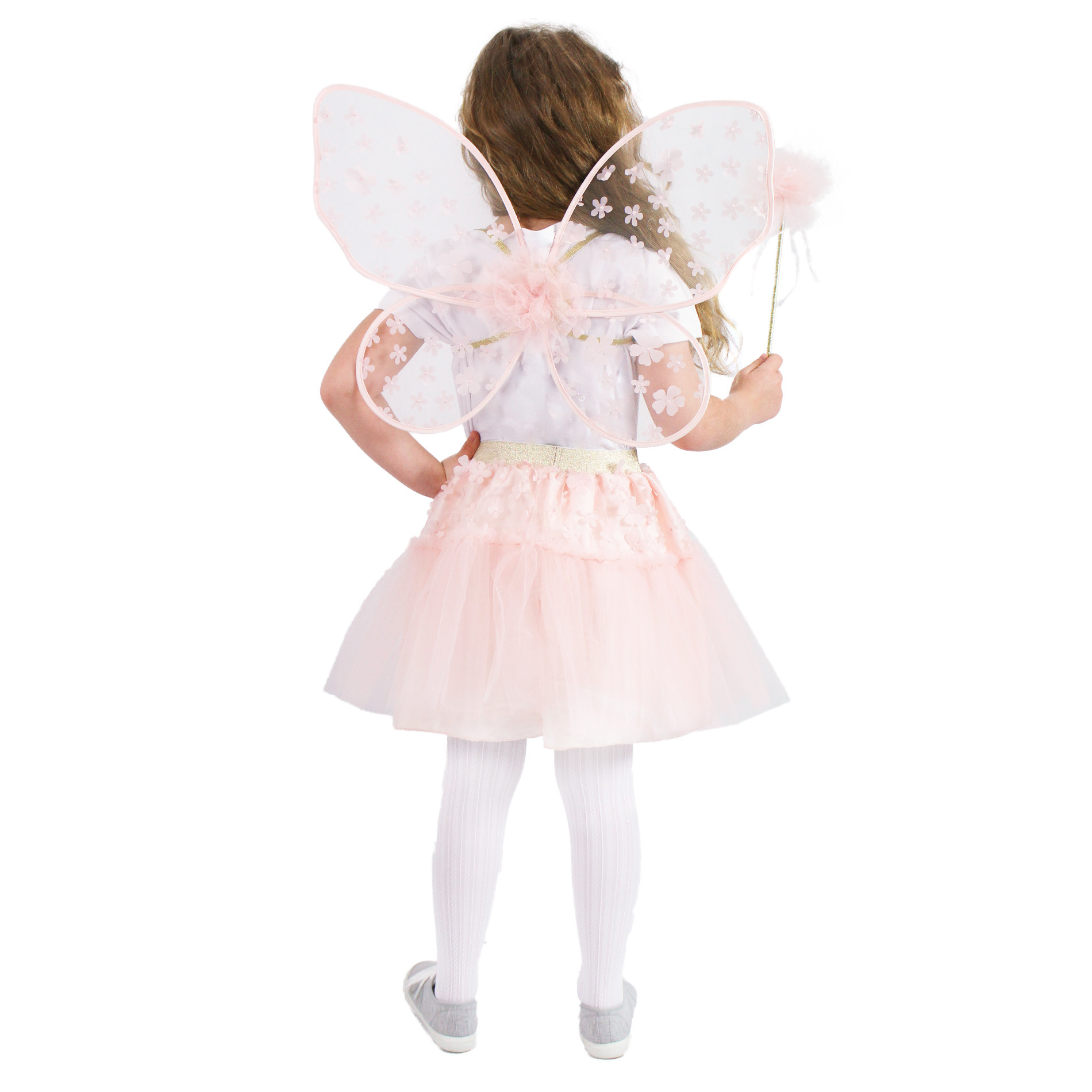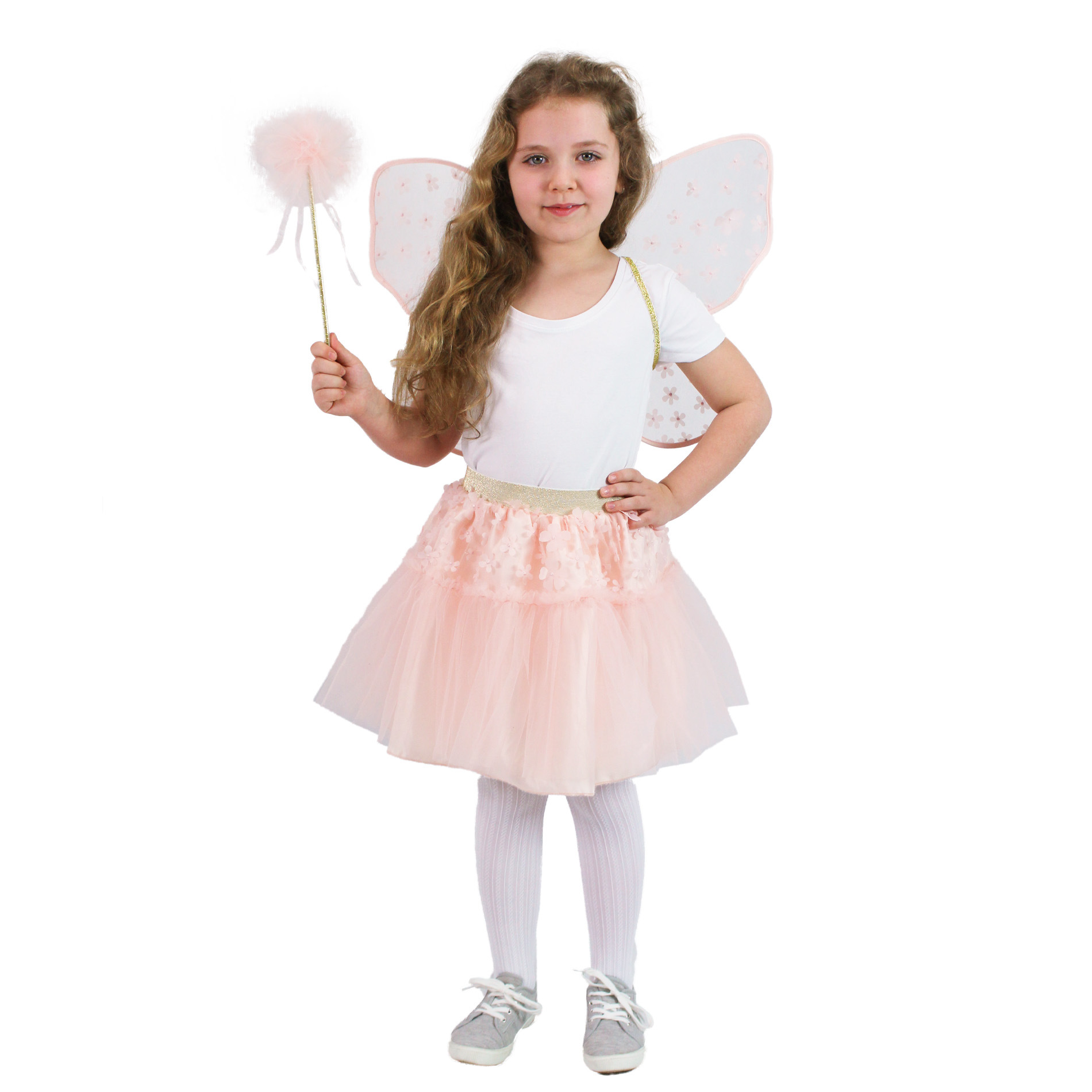 Wunderschönes Feen-Set für kleine Mädchen! Das Set enthält einen rosa Tüll-TUTU-Rock mit einem Satin-Unterrock. Der Rock ist mit kleinen Blumen und einem goldenen Gummiband in der Taille verziert, dazu gibt es perfekt passende Flügel und einen Zauberstab mit dem gleichen Motiv. Der Rock ist ca. 35 cm lang und eignet sich für einen Taillenumfang von 50-60 cm. Konzipiert für Mädchen im Alter von 3–10 Jahren (104–146 cm).