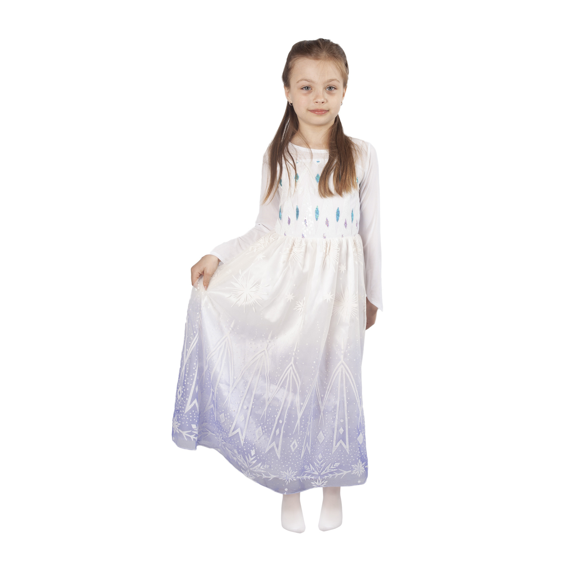 Úchvatný dívčí kostým pro všechny zimní princezny! Dlouhé šaty v bílé barvě jsou v horní části zdobené flitry, od pasu dolů je bílo-fialová tylová sukně zdobena potiskem. Součástí šatů je také vlečka dekorována flitry. Kostým ve velikosti S je určen pro holčičky ve věkovém rozmezí 4-6 let (105-116 cm).